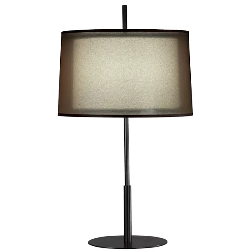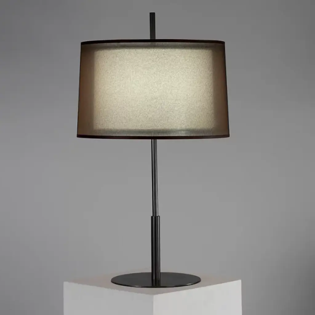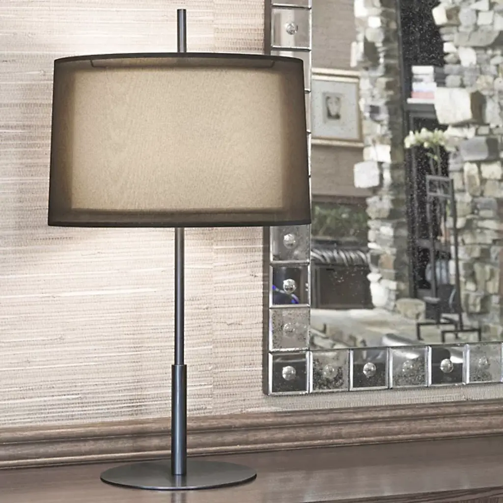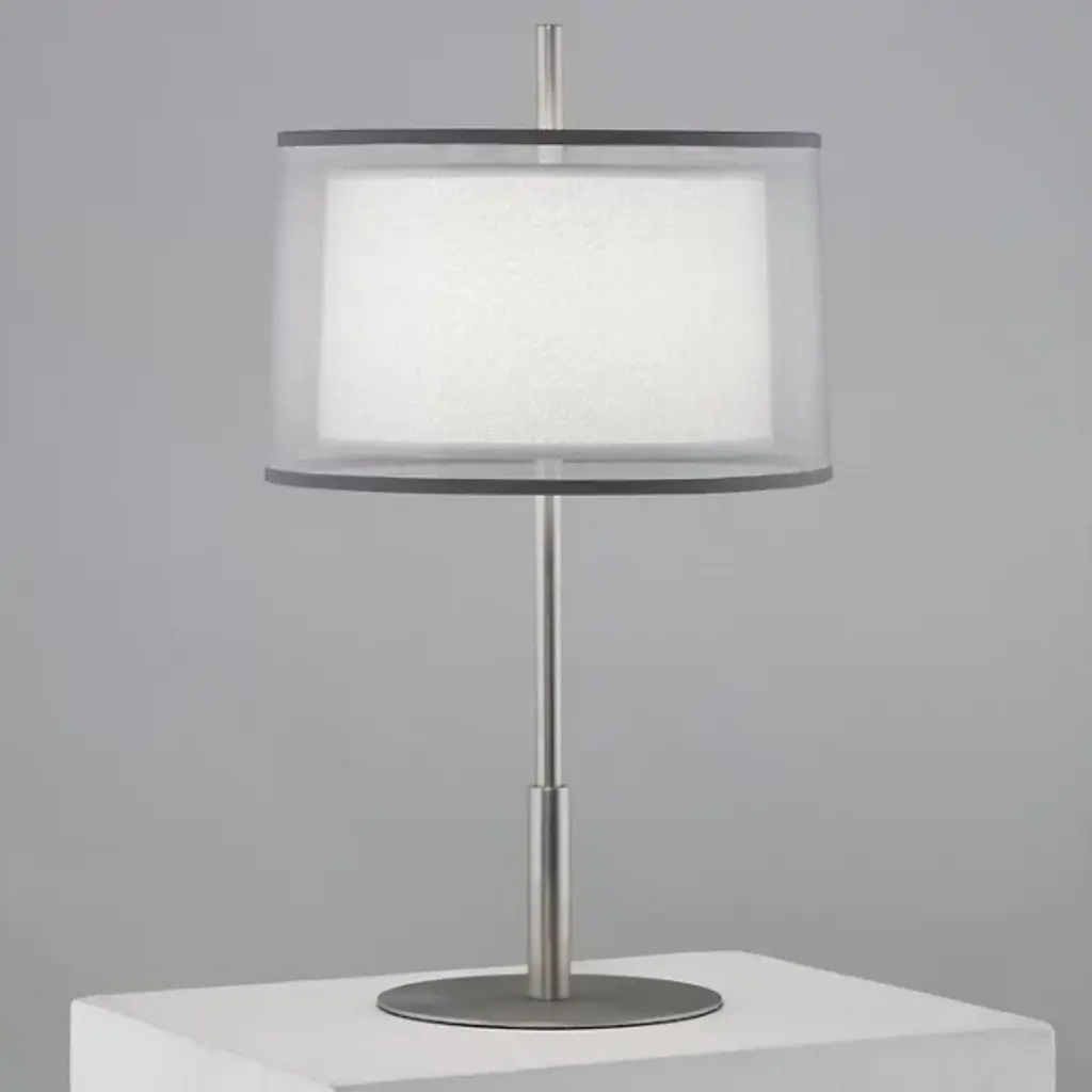 Diaphanous, cool, contemporary. The Robert Abbey Saturnia Table Lamp adds all such elements to contemporary decor. The outer translucent fabric shade glints with a sheer metallic sheen as it "orbits" around another shade of Ascot White fabric. This singular dual shade structure sits atop a base finished in a complementary finish. Available in two shade and finish combinations.