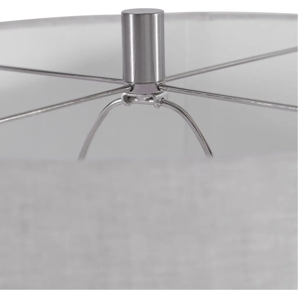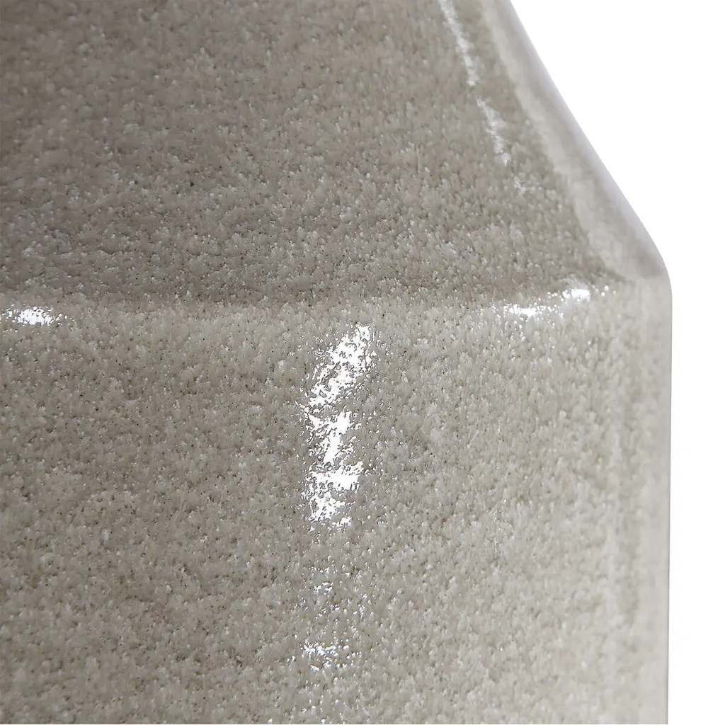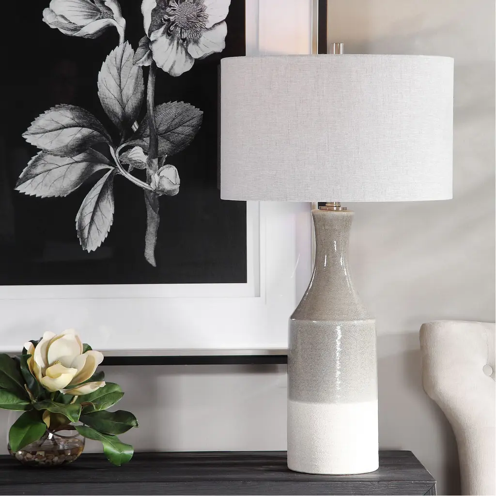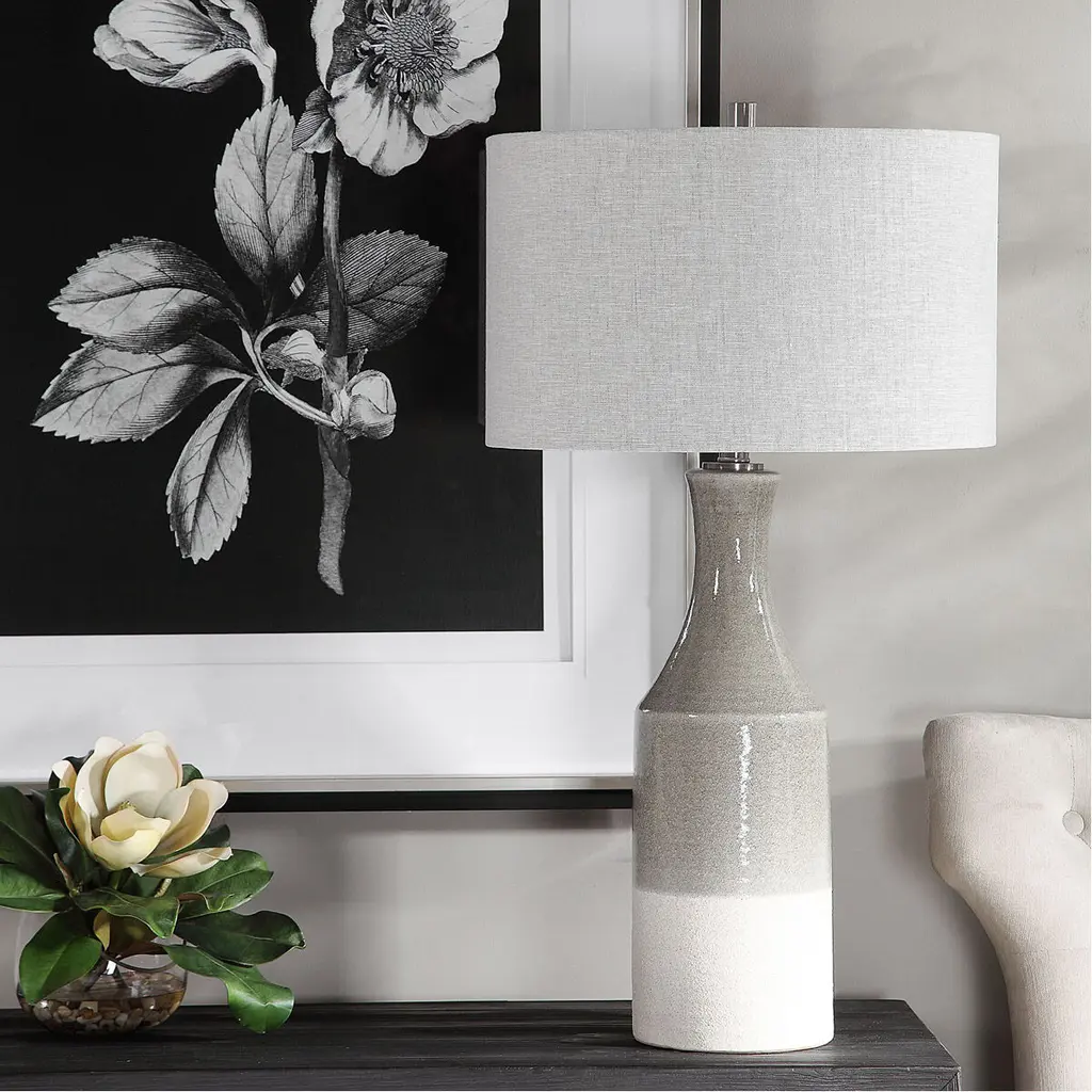 Showcasing A Bohemian Flair, This Ceramic Table Lamp Is Finished In A Glossy Warm Gray Glaze That Transitions To A Heavily Textured Ivory Bottom. The Hardback Drum Shade Is Light Gray Linen With Natural Slubbing.