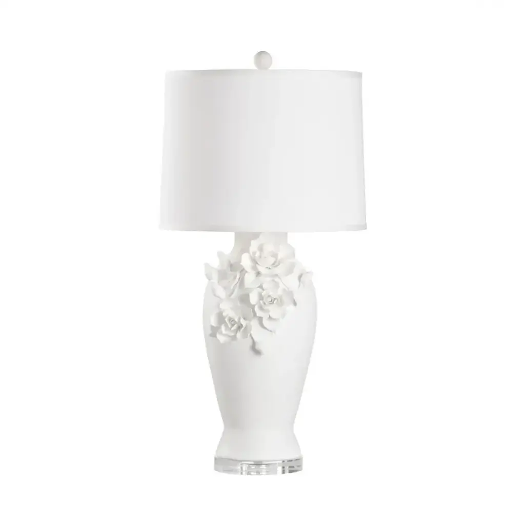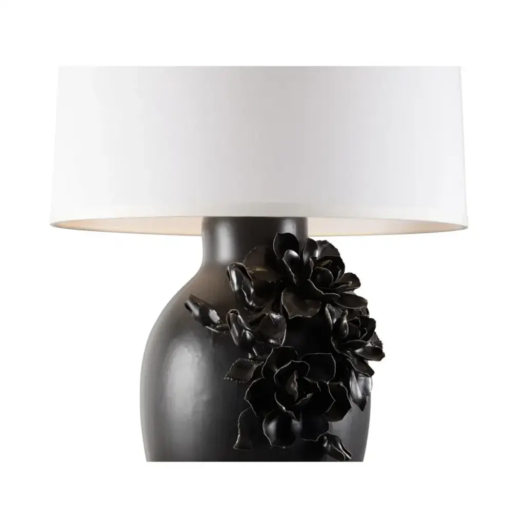 DONNED WITH DELICATE MAGNOLIA BLOOMS, A NOD TO CHERYL'S MISSISSIPPI ROOTS, THE SAVOIR FAIRE LAMP IS THE EPITOME OF CLASSIC STYLE AND GRACEFUL ELEGANCE. PART OF THE CHERYL LUCKETT COLLECTION FOR WILDWOOD, THIS STATELY TABLE LAMP IS SURE TO ADD HIGH STYLE TO ANY SPACE. (BLACK: TPX 19-4006)