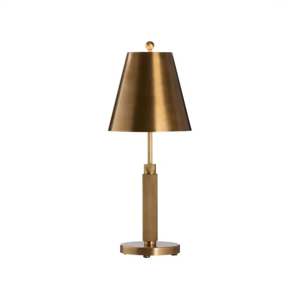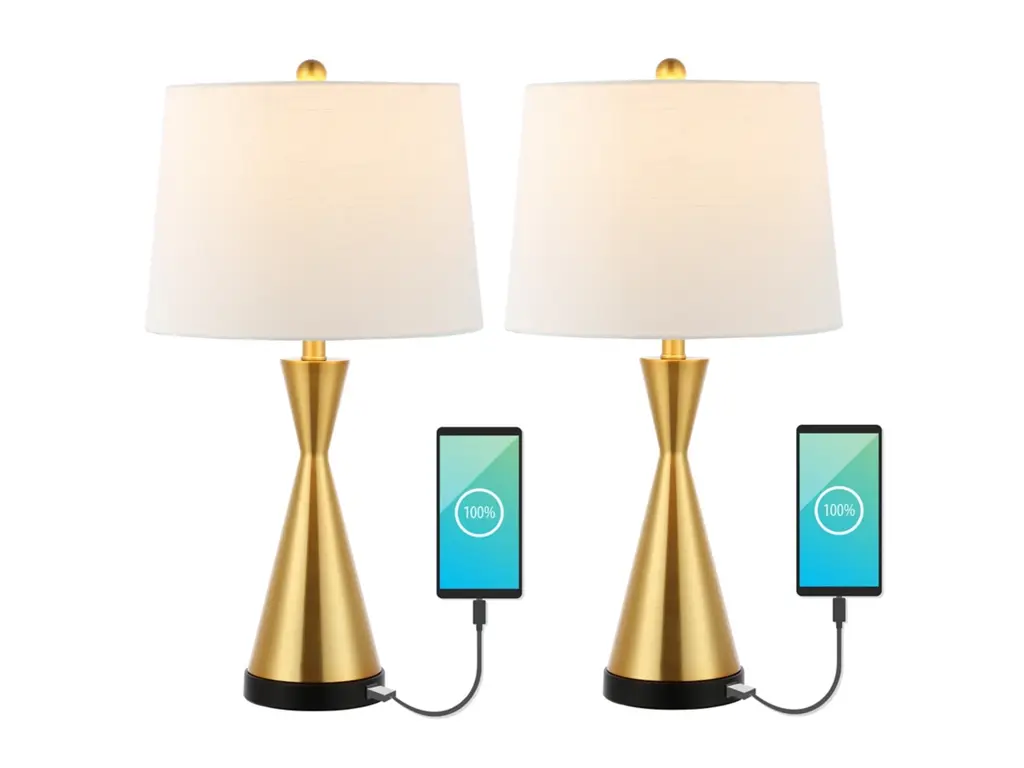 The Sawyer Gold Brass 21" Metal Table Lamp Set of 2 by The Essentials adds a modern touch to your bedroom decor. With a metal base and shade, these lamps provide both durability and style. The natural brass finish complements a variety of interiors.