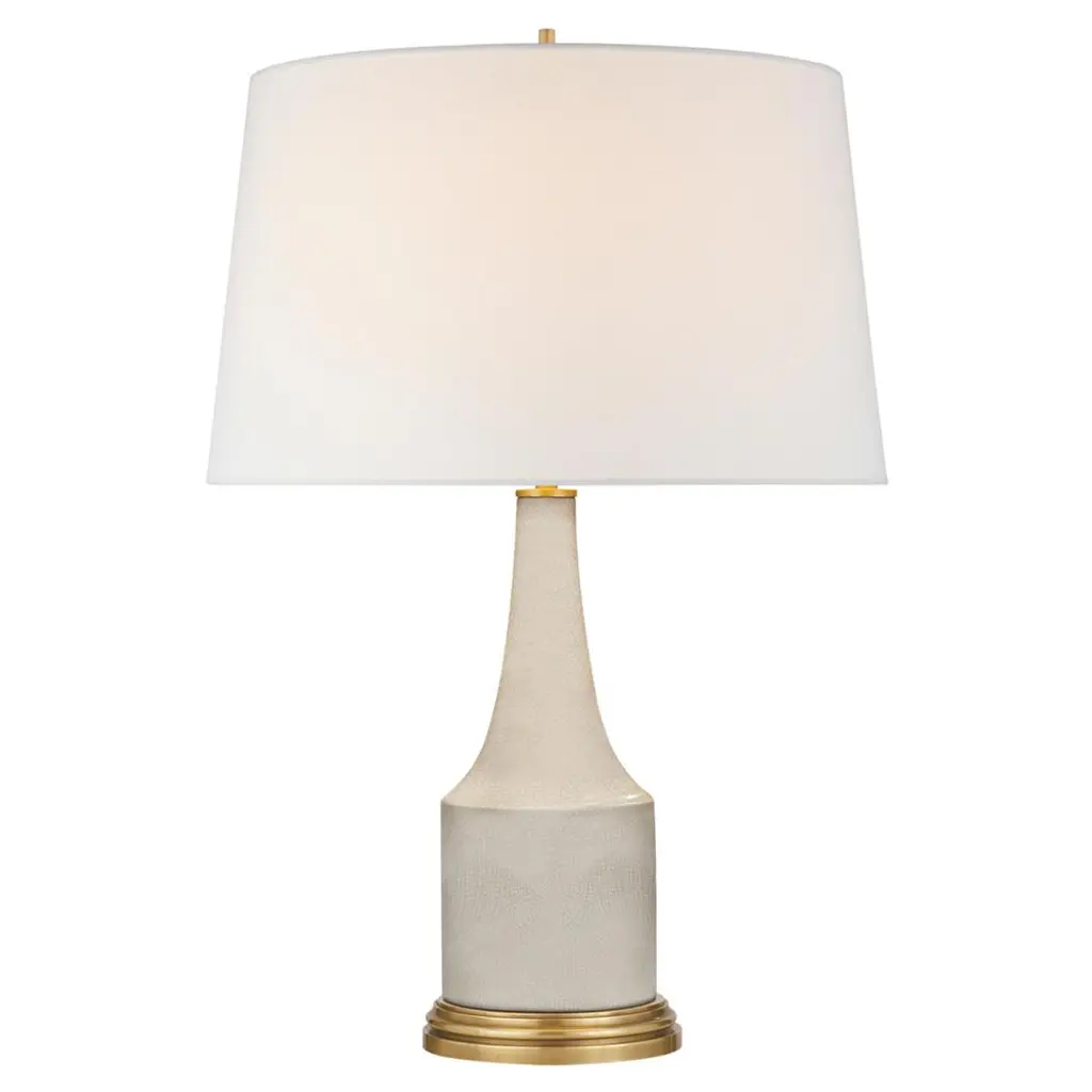 Beautifully crafted from porcelain with an elegant tea stain crackle finish, this table lamp has a versatile style that will work well in any decor. Topped with a white linen shade.
