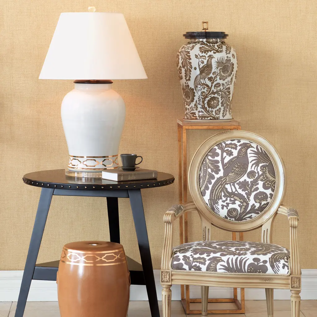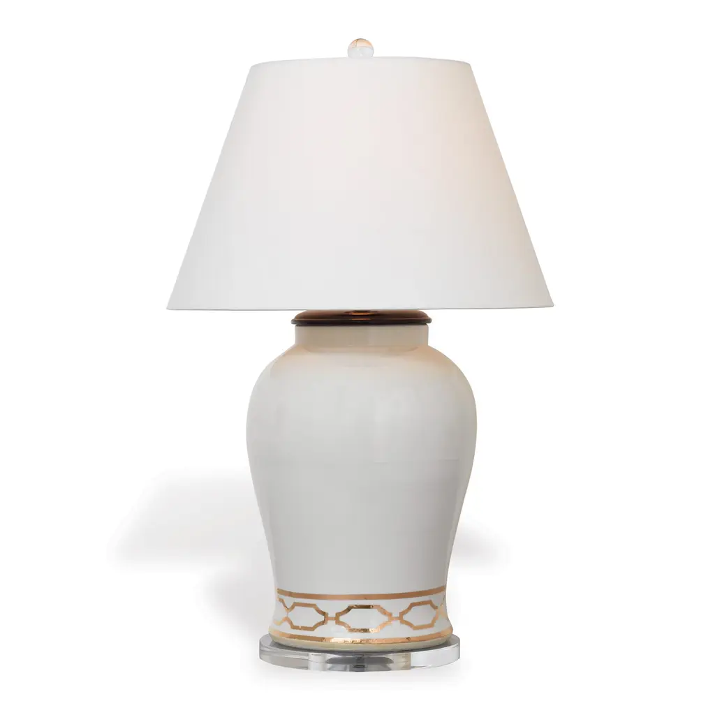 Scalamandre Maison by Port 68 Pavillion Coral Lamp. A classic ginger-jar shape accented with a golden trellis border and a Lucite® base make this lamp a charming addition to room lighting. Handcrafted of porcelain, brass, and Lucite®. Crystal ball finial. Polyester shade. Three-way switch; uses one 150-watt bulb. 23"Di