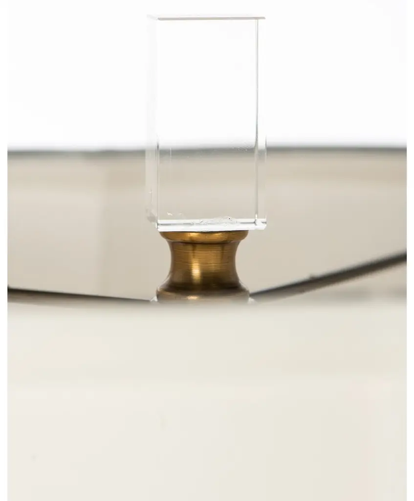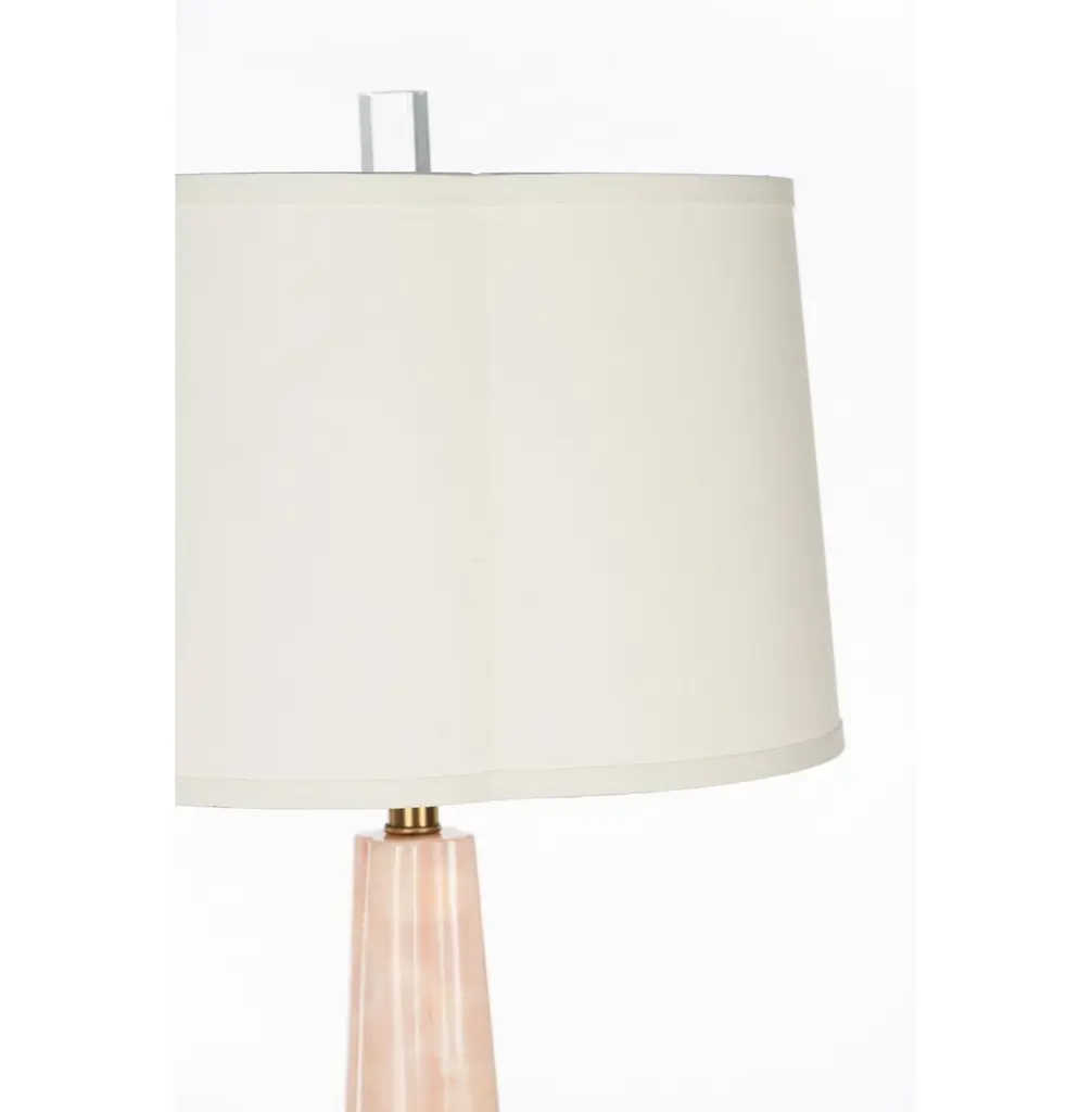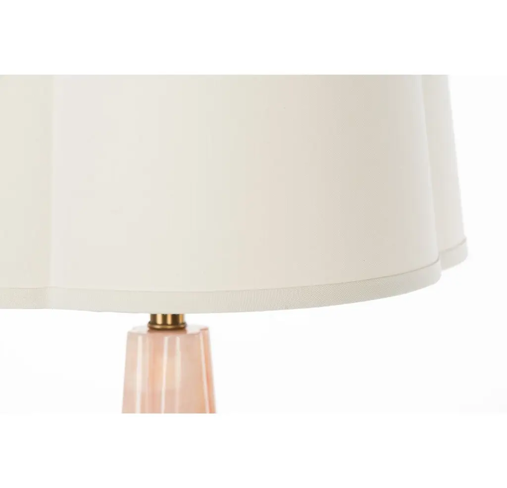 This sculptural table lamp is crafted of rose quartz with a scalloped, tapered body resting on a clear crystal base. A subtly scalloped shade in off-white linen completes the luxe look.