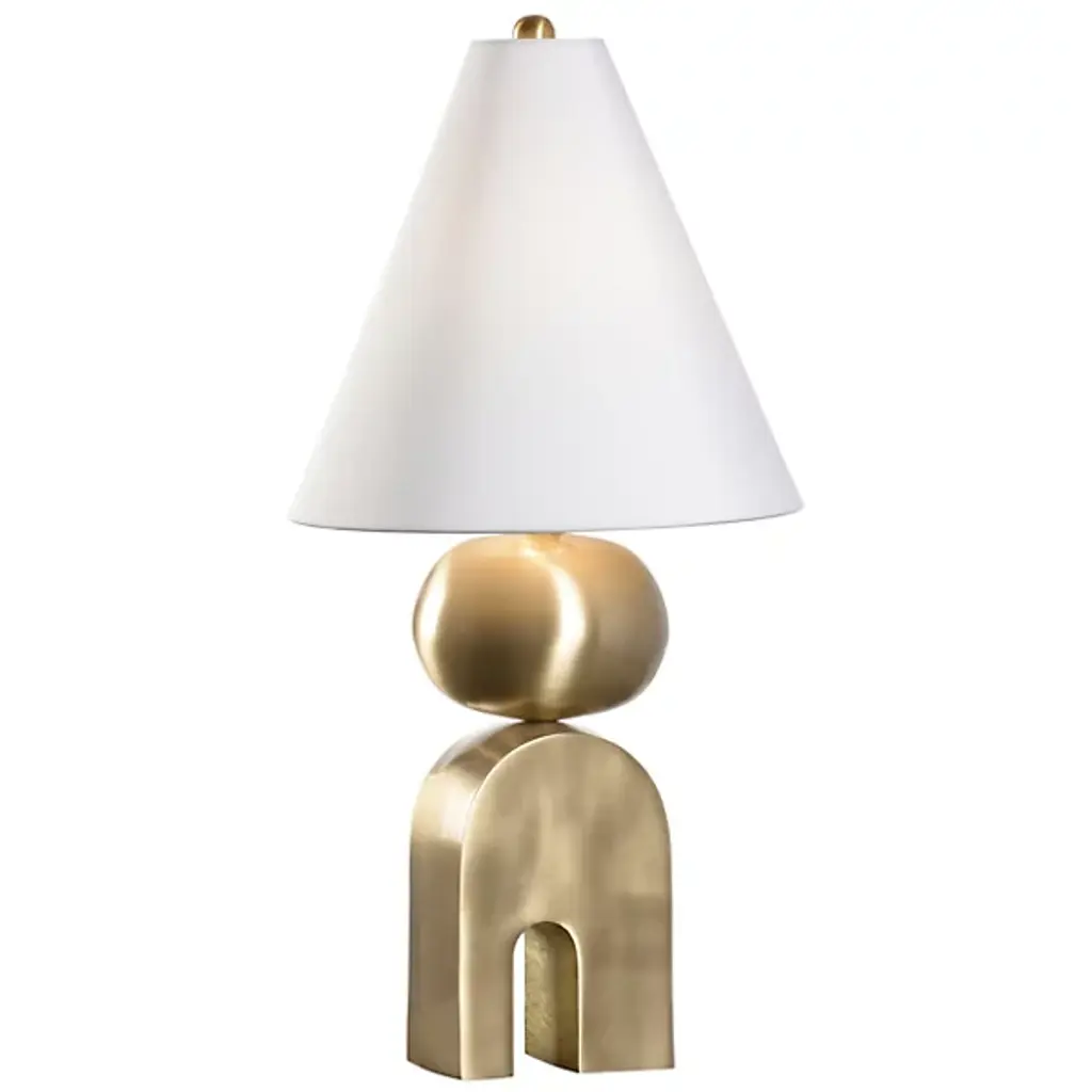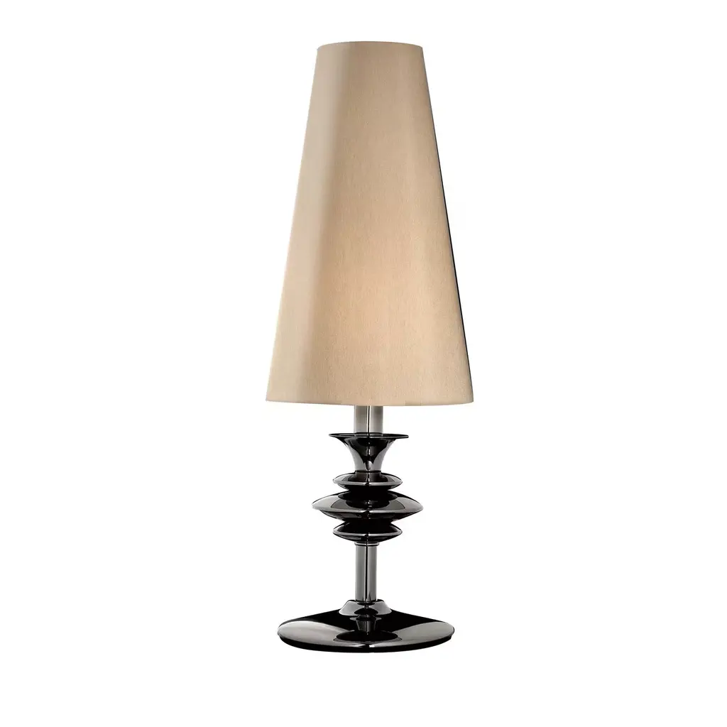 Boasting an elongated shade supported on a long stem, this table lamp has an elegant and slender silhouette. The black shade is made of rigid fabric and features a truncated cone shape, while the slim stem, mounted on a circular base, has three round-shaped elements towards the end of the stem, adding a distinctive allure to this piece. The metal and brass structure is marked by a polished gold finish and is also available in other options, please ask the Concierge for details.