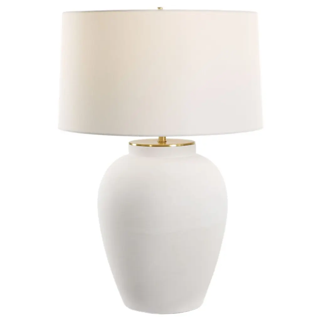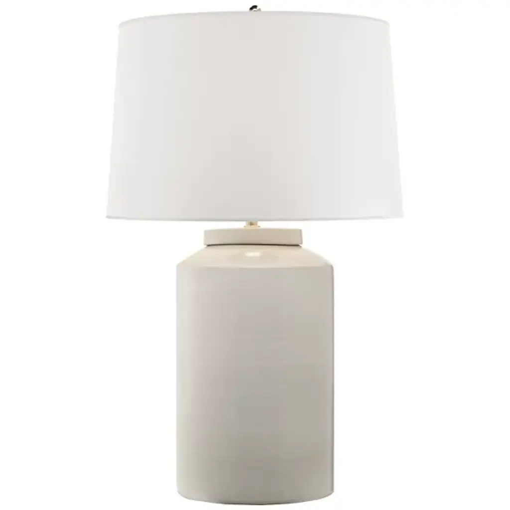 Adorn your favorite space with the clean silhouette of the Scatchard Table Lamp from House of Troy. The wide, cylindrical boy is made of smooth ceramic. It sharply curves inward at the top, thinning into a brief neck that upholds a white linen hardback shade that houses a single bulb. The light emitted from the bulb is clean and expressive, diffusing softly into the material and establishing an inviting ambiance in the space perfect for relaxing at the end of a long day.
