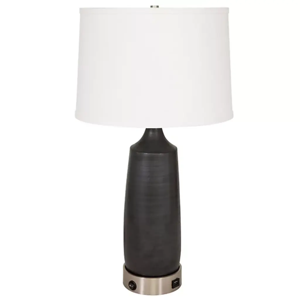Add a touch of beauty to your favorite space with the modern Scatchard Table Lamp with USB Port Base from House of Troy. A reflective, circular metal base mounts the body of the piece. Matching the width of the base, the body is made of ceramic and gently thins near the top as it presents an off white linen hardback shade. A single bulb rests within the shade, diffusing a clean and even glow that livens the ambiance of the space. The side of the base contains a power switch and a USB port for charging devices.