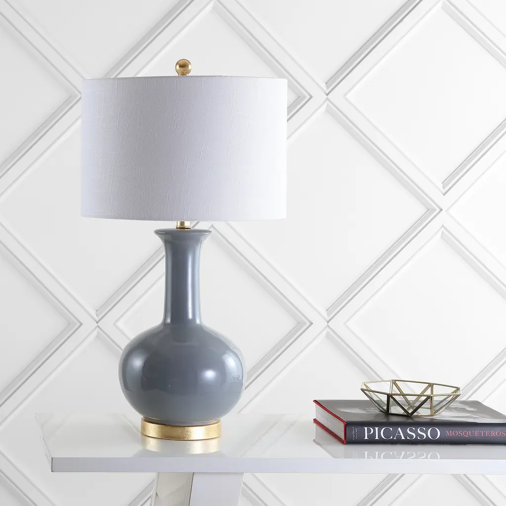 Curves and shine combine to create an alchemy of traditional and modern design in this attractive table lamp. The linen hardback drum shade adds a soft element to the glazed ceramic and brushed brass base. The designer elements extend to the plug, with a 60" silk-wrapped cord. Features:Dimensions:About us:You see a lamp.We see a decorative work of art.A perfectly curved shade casts a dramatic shadow on a floor. A silk cord you never want to hide. LED lightbulbs: as easy on the environment as they are on the eyes. The JONATHAN Y Lighting collection considers every detail from impeccably sourced materials to designer styling. And our prices are so attractive, we've transformed a functional necessity into a fashion accessory.JONATHAN Y Lighting - a fashion revolution in home decor.