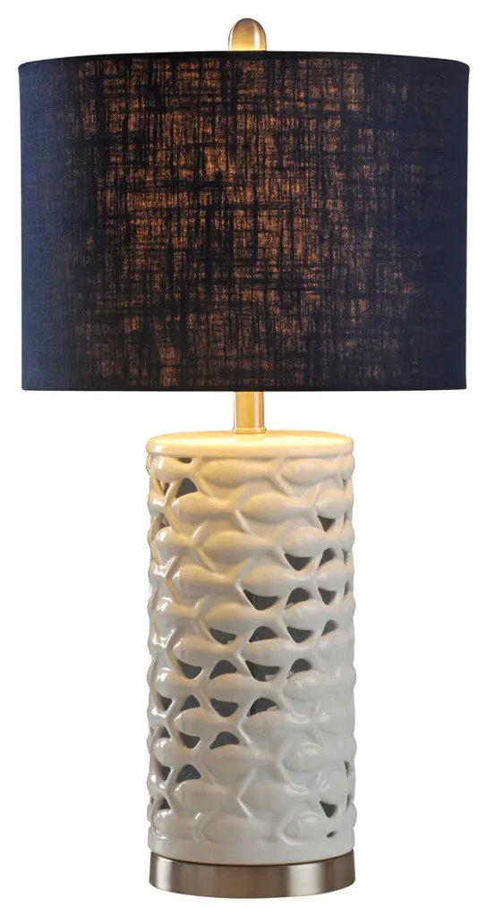 School Of Fish Cylindrical Table Lamp, White,silver,sand, Navy Blue