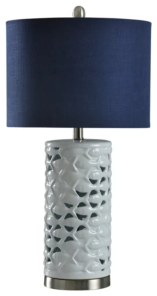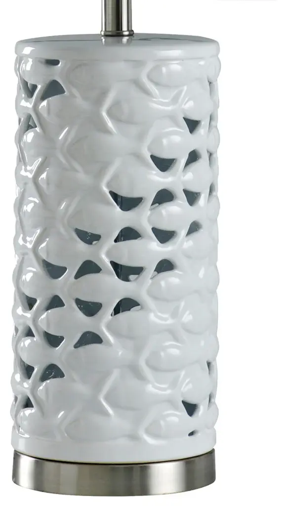 Does the rest of your home have a nautical theme? Then you need to add the White Ceramic School of Fish table lamp to your living room. The body also has steel in addition to ceramic complete with a white and silver steel finish. There are also touches of sand color you will find along the edges of the fish. The round, hardback shade continues the oceanic motif with navy blue coloring.Features: Brush nickel metal turn knobA handpainted finish means each piece is unique, with possible slight variations. No two lamps are exactly alike.Finish: White,Silver,SandShade Finish: Navy BlueMaterial: Ceramic,SteelShade Material: Hardback FabricLength: 14 inchesWidth: 14 inchesHeight: 27 inchesVoltage: 120VWattage: 100Safety Rating: Dry Location - This item is rated for dry locations, meaning it can be used in an indoor area that is not normally subject to dampness. May include a location subject to temporary dampness provided ventilation is adequate to prevent any accumulation of moisture such as the bathroomBulb(s) Included: NoBulb Type: IncandescentNumber of Bulbs: 1Due to lighting and monitor differences, actual colors and finishes may vary slightly from what appears online.