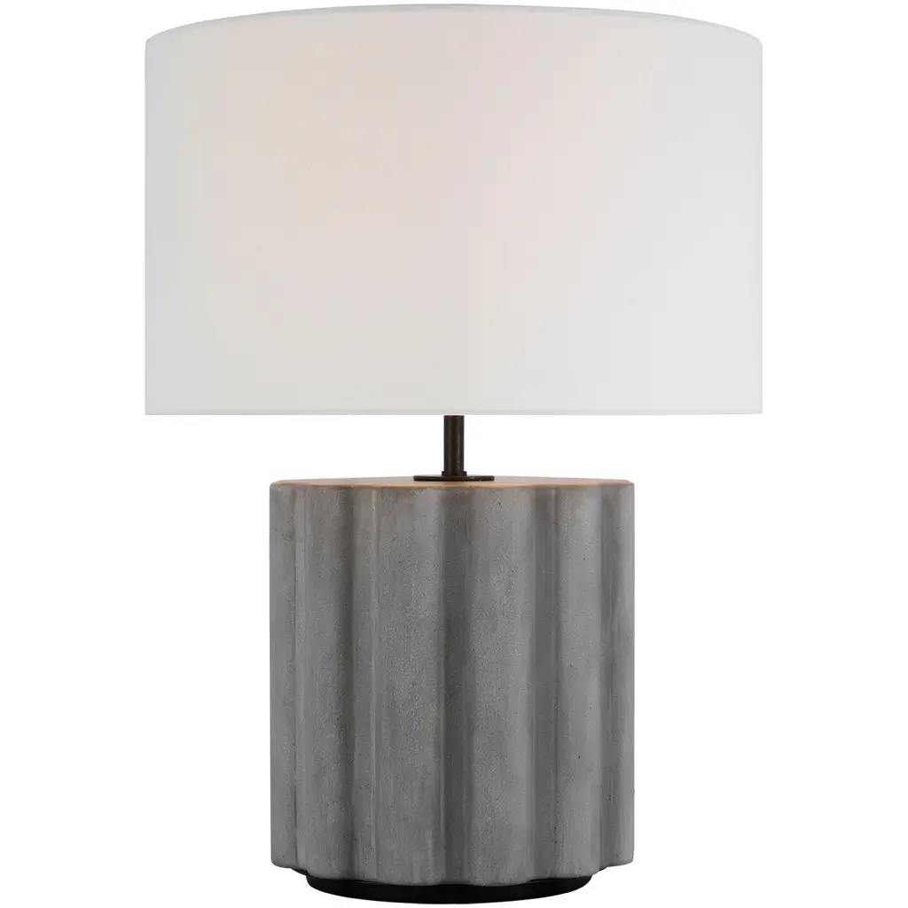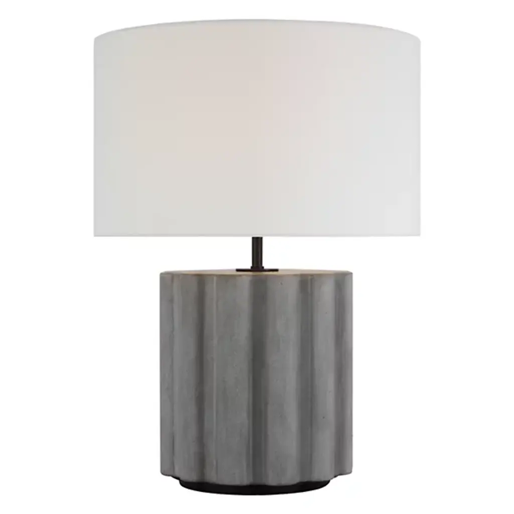 Bring a bold Bohemian presence to interior tables and workspaces alike with the Visual Comfort Signature Scioto Table Lamp designed by Chapman & Myers. A simple study of contrasting materials starts with a rounded metal base, surrounded by a vertically striated concrete column that keeps a touch of welcome character and contours on display. A slender metal rod extends a single socket inside a broad linen shade, expressing mellow warmth around the focused downlight.
