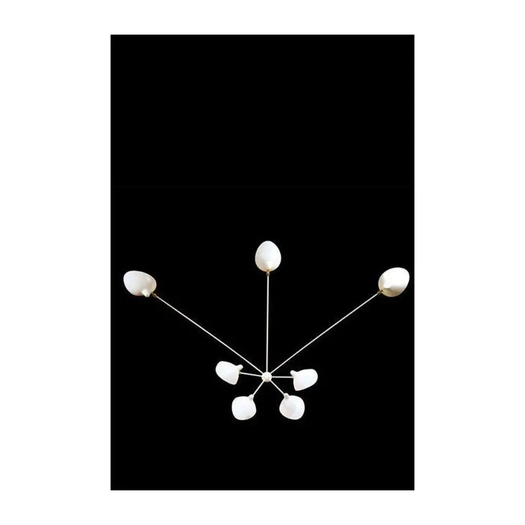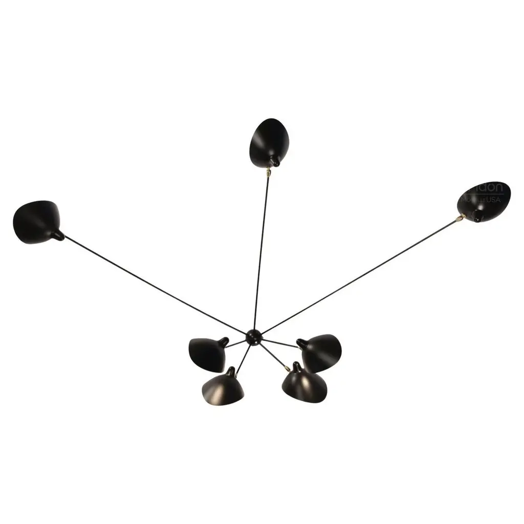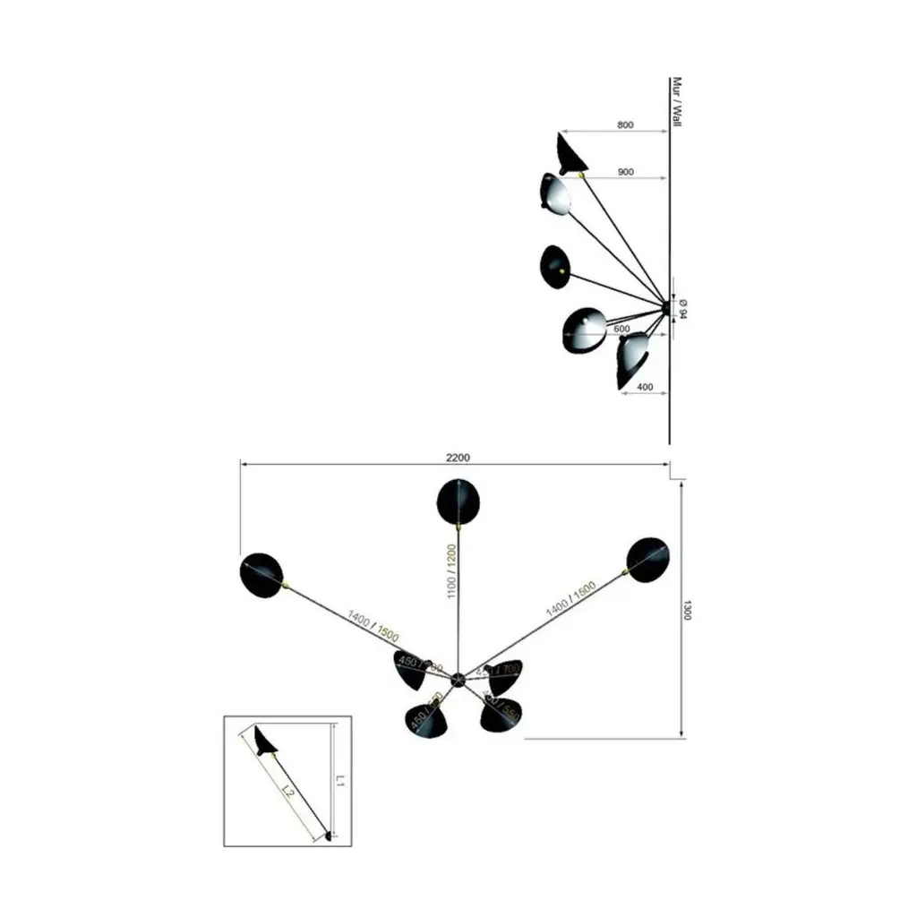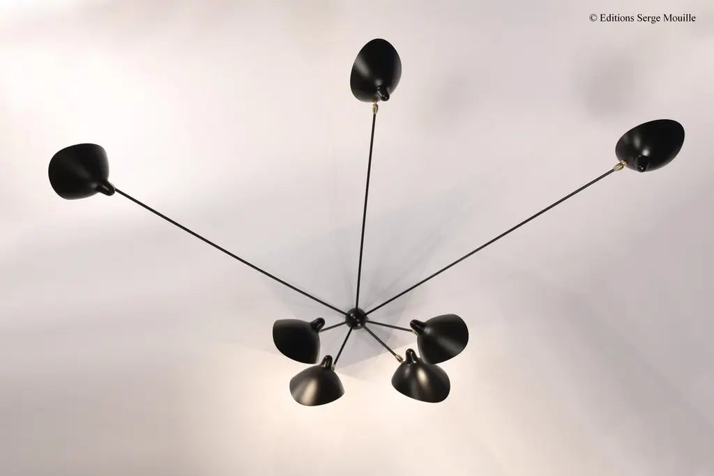 Sconce spider 7 still arms by Serge MouilleDimensions: D220 x W90 x H130 cmMaterials: Brass, Steel, AluminumOne of a King. Numbered.Also available in different color. All our lamps can be wired according to each country. If sold to the USA it will be wired for the USA for instance.This Serge Mouille Spider 7 fixed arm wall light consists of 3 large and 4 small black or white steel rods, each supporting a mobile aluminum reflector with a shiny white interior. Made in France by Éditions Serge Mouille, this numbered reissue from 1953 comes with its certificate of authenticity.Serge MouilleBorn in Paris in 1922, Serge Mouille is today considered one of the greatest lighting designers in the world. He developed a talent for drawing and creation very early on and was the youngest student of his time to be admitted to the School of Applied Arts at the age of 13.Master goldsmith, Serge Mouille learned the art of modeling metal with a hammer thanks to his mentor Gabriel Lacroix and worked for several goldsmith houses in Paris. It was his meeting with Jacques Adnet, director of the Compagnie des arts français, that would mark a turning point in his career.In 1951, Jacques Adnet commissioned Serge Mouille to create a “large light fixture” for his South American customers: the first three-arm floor lamp was born. This innovative luminaire in molded black steel with organic shapes will influence his famous series of "Black Forms" and will forever mark the history of design. Serge Mouille then passes from the status of master craftsman to that of creative artist.At the beginning of the 1960s, Serge Mouille decided to radically distance himself from everything he had created until then by developing a series of light columns with fluorescent tubes. In 1963, he stopped producing lights to devote himself to teaching.Suffering from tuberculosis, Serge Mouille died in 1988 and his widow, Gin Mouille, decided to continue to bring his art to life by publishing under license his most emblematic creations. Each copy is made in France by Éditions Serge Mouille and has an engraved serial number, accompanied by a certificate of authenticity.