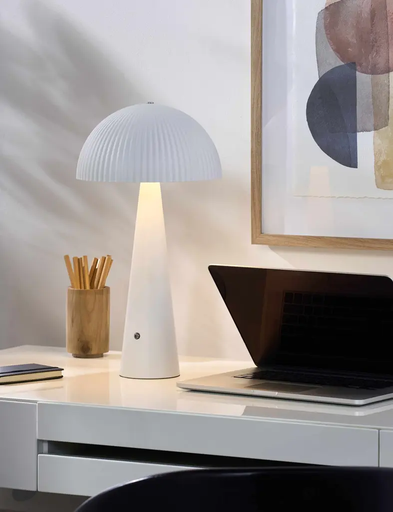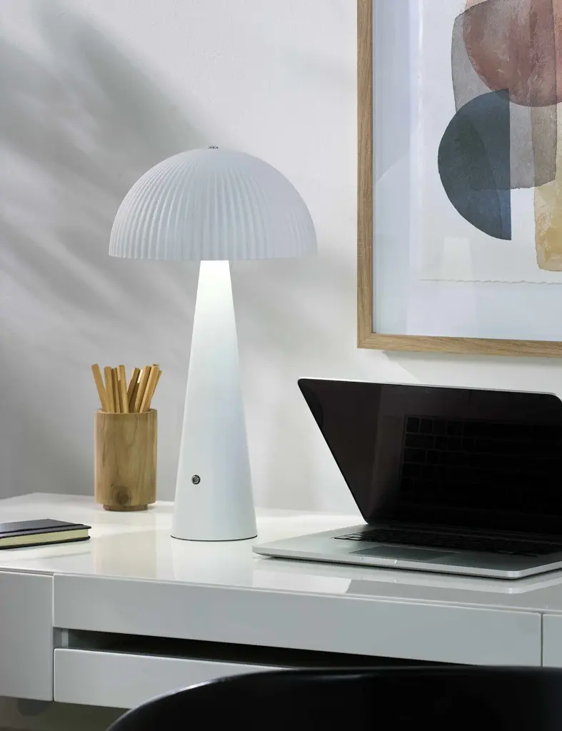 Collection: Scontrone Colors: White Material: Body: Iron / Shade (Outside): Metal / Shade (Inside): Metal Styles: Contemporary Made In: China Lighting Type: Accent Table Lighting Shade Material: Metal, Metal Shade Color: White, White Cord Length: 0' Switch Type: Dimmer Number of Bulbs: 1 Socket Type: LED