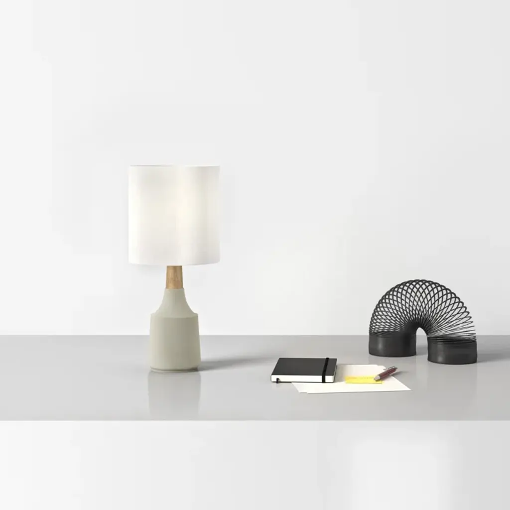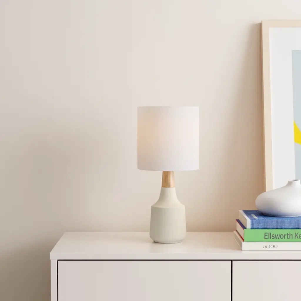 Warm light + mixed textures. With its resin base and wooden neck, this accent lamp brings natural materials and Scandi-inspired vibes to your side table. Its bottle-shaped silhouette is complemented by a white linen drum shade that diffuses light throughout your space.