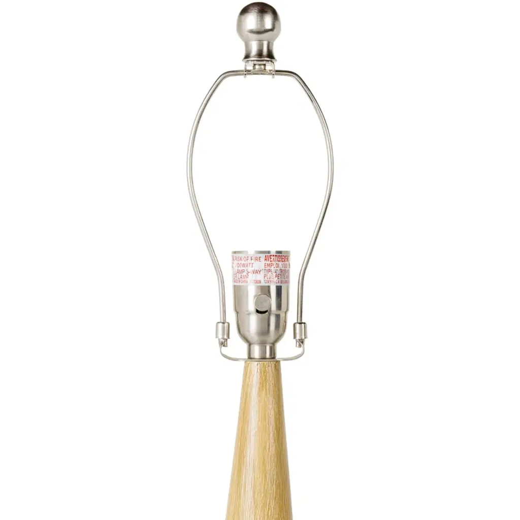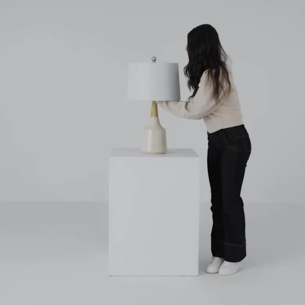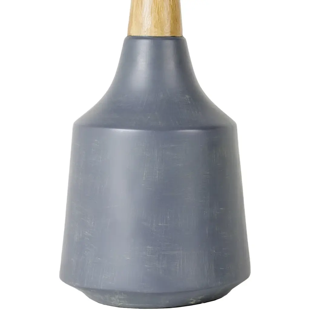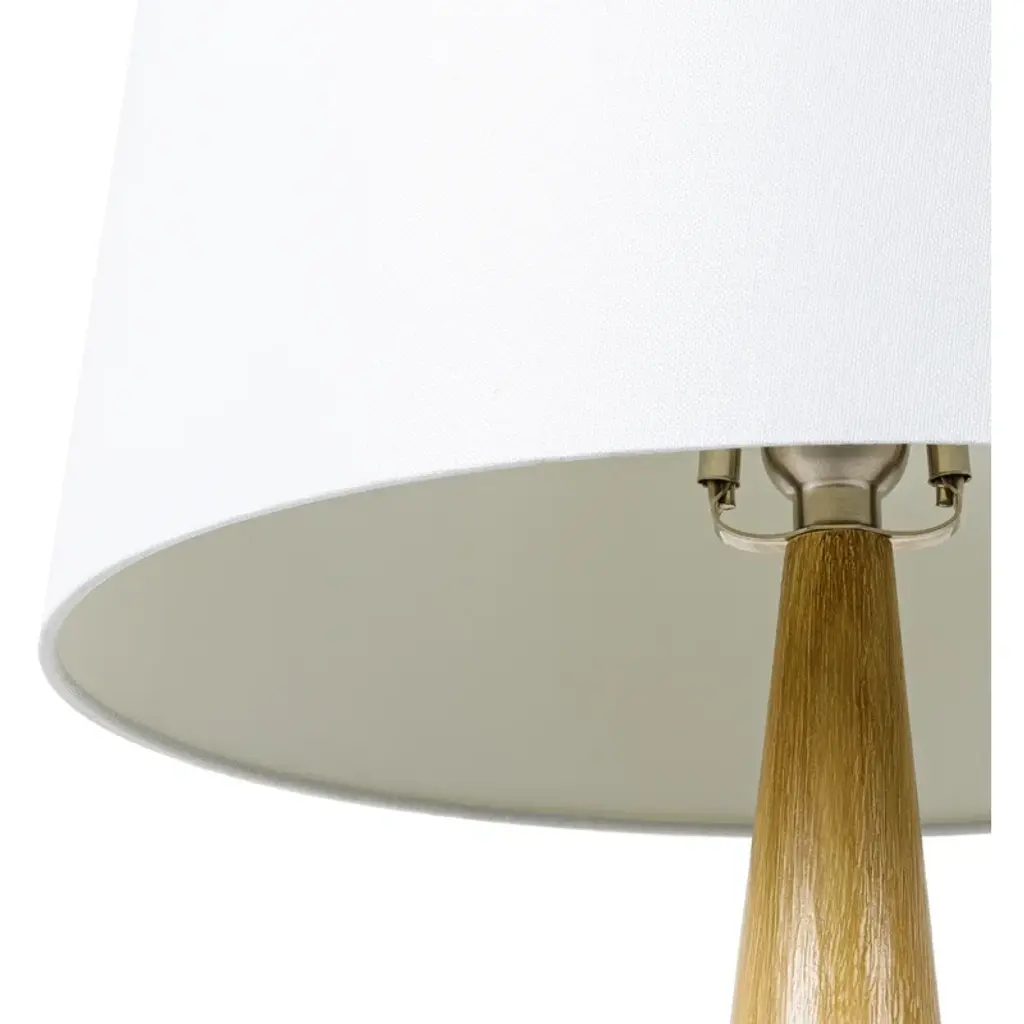 Crafted from ceramic with a smooth neutral glaze and pale wooden accents, this table lamp delivers a streamlined + organic look drawn from Scandi style. A linen drum shade with tapered edges balances the bottle-shaped silhouette, weaving in texture and softening the light from a single bulb.