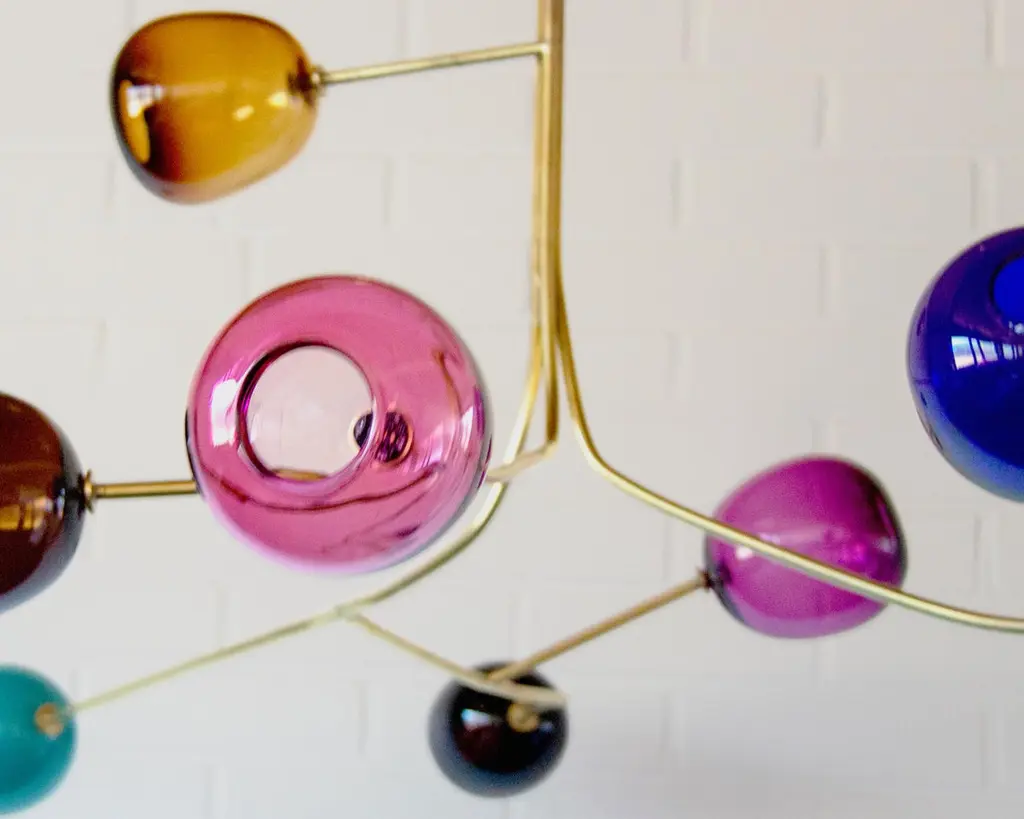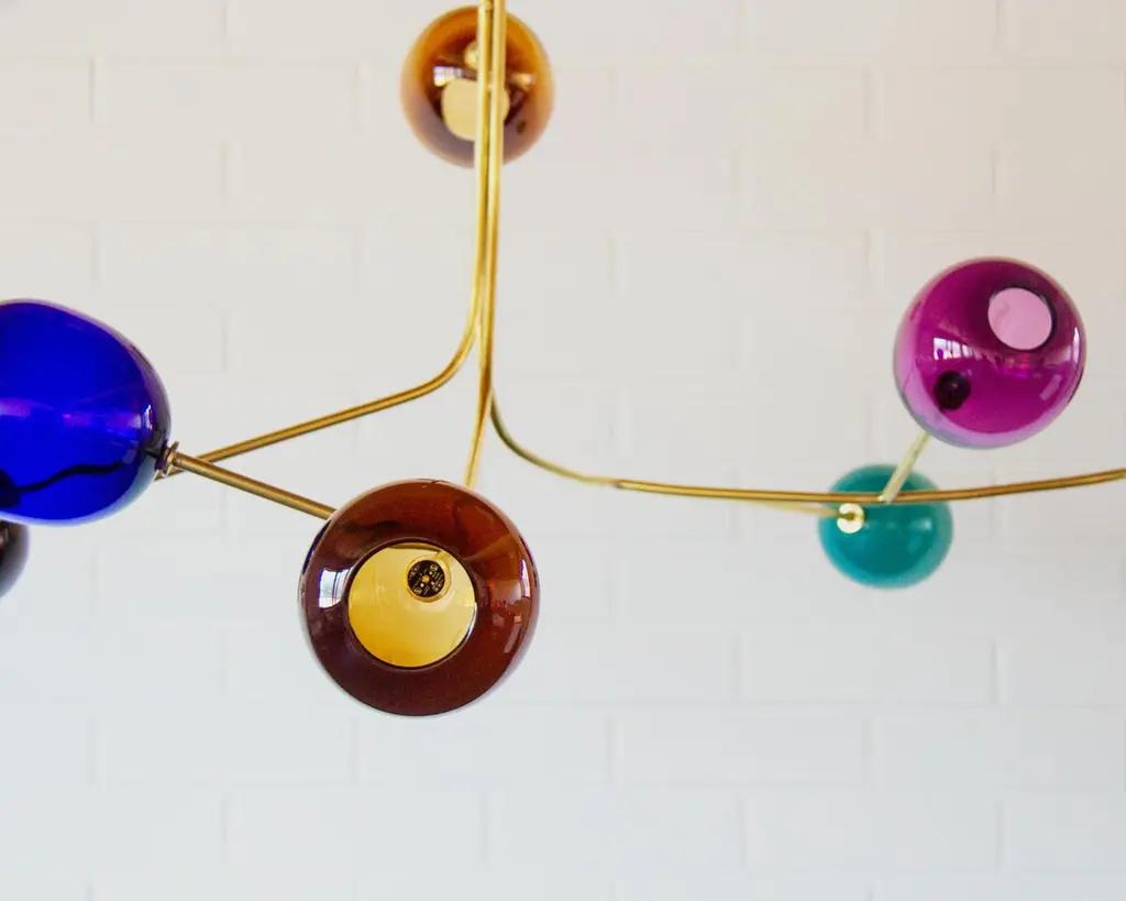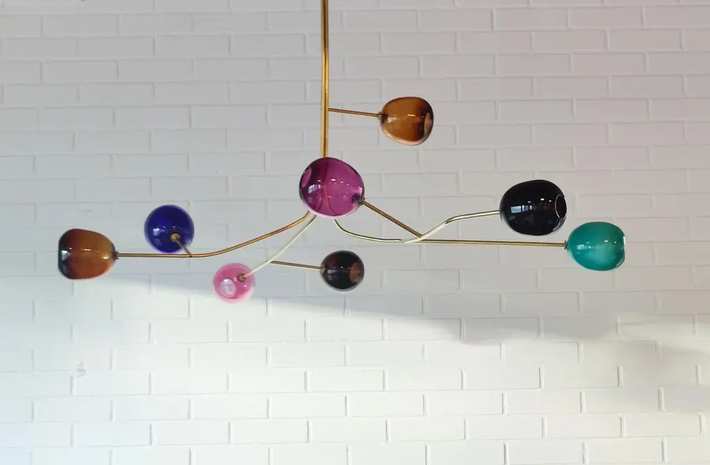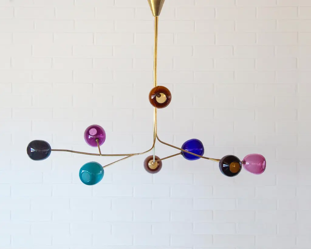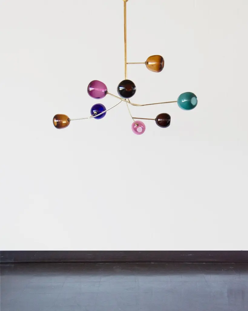 Sculptural light no. 51 by Milla VaahteraDimensions: D150 x W100 x H100 cmMaterials: glass, brassVariations available.These images are skeches and the final model will be designed as a small scale model and 3d modelling before production.Colors can be customizes. Can be done with LED or GU9 lights.Each pendant is unique. The color combination and shape of the fixture will be confirmed by drawing before the order.In 2020 Milla Vaahtera started a series of unique sculptural lights made out of brass and hand blown glass."I have focused on mobile art work for the past few years and this series with light is a natural continuum of that work. These lights are all unique and made by a very intuitive process. Glass parts are made in collaboration with a team of glass blowers from Nuutajärvi Glass Village. The creative process of joining methods of art to traditional areas of craft is the most important thing to me in my work. Traditionally craft has been an area where professionals avoid failure. Lack of failure makes them good. I'm revolutionary in embracing failure in the craft process. I always find new techniques via failure. Failure is not opposite to success, it's a necessary part of it. When I find the flow of “not giving a shit” in my work, I find freedom and fun, and achieve the best work. Embracing failure shuts up the critical comments in my head and I’m liberated. I´m inspired by everything and find influences all around me. I find leaving some tool marks to the brass and "the mistakes" refreshing. With glass, the pieces where you could see the moment of melt in the final work are always my favorites. And I felt that now I work in dialogue with glass. I learned to use improvisation at the moment to maintain the wild nature of glass. Glass is like me, spontaneous and organic. " Glassblowers: Paula Pääkkönen, Sani Lappalainen, Otto Koivuranta, Jukka Viuha, Penna Tornberg and many other glassblowers from Nuutajärvi.The metal parts: Silversmith Kirsi Kokkonen together with Milla VaahteraElectric work Ullanlinnan sähköVaahtera began to work on this series in May 2017 together with glassblowers Paula Pääkkönen, Sani Lappalainen, Pauli Vähäsarja, Henni Eliala and Jonas Paajanen of Nuutajärvi. The metal parts were prepared by silversmith Kirsi Kokkonen together with Milla Vaahtera. The method was based on dialogue with the glass artists, improvisation and intuition.The ethereal pieces are a revival of the mobile tradition that emerged in the 1930s.The heavy glass parts and the delicate brass seek a balance with each other, thus creating tensions within the works.Milla Vaahtera (born 1981) is a designer and an artist working in Helsinki. The themes of her works extend from body image and sexuality to intuition and dialogues in the creative progress. Vaahtera has graduated as a Master of Arts in 2010 from Aalto University, the School of Arts, Design and Architecture. She did her BA studies in Lahti Institute of Design in 2008. Her work is featured in several exhibitions at galleries and museums including the Design Museum Finland, Lokal gallery and UU Market.She is most known of her Dialogue series, mobiles and stabiles, in which she combines bold glass parts with delicate brass. The process of making dialogue pieces is based on dialogue and improvisation. Vaahtera is passionate to Revive the Finnish heritage of glassblowing and give young generation of makers new opportunities to deepen their skills. All our lamps can be wired according to each country. If sold to the USA it will be wired for the USA for instance.
