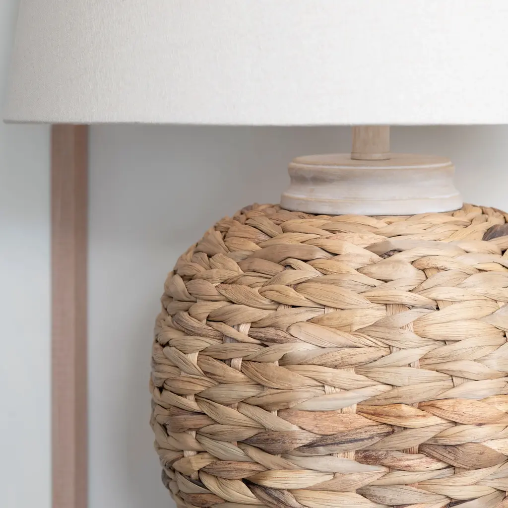Add coastal elegance to your space with our Woven Water Hyacinth Table Lamp. The natural golden brown finish and basket weave pattern of water hyacinth over a sturdy metal frame exude natural charm. Paired with a light tan, white-washed metal base and a tapered linen drum shade, this lamp brings warmth and style. Featuring a 6-foot clear cord, turn-key switch, and UL/cUL approval, it’s both beautiful and functional. Requires a standard E26 150W max bulb (not included) for the perfect glow.