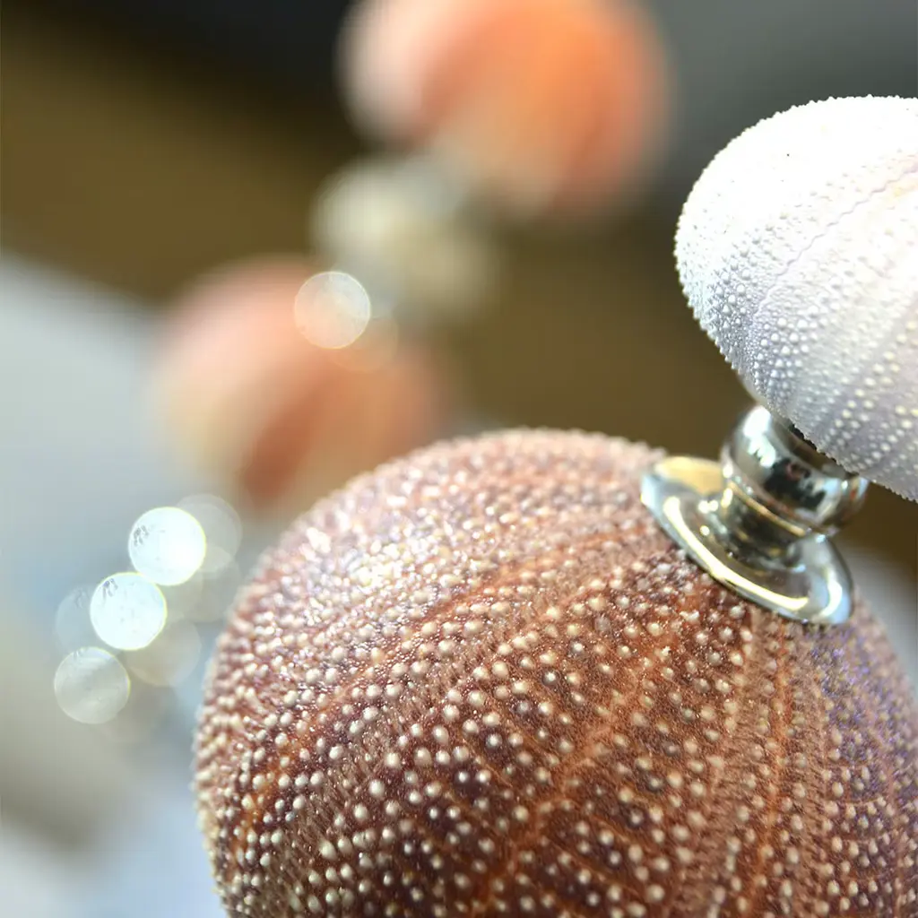 Measuring 88 cm in height, this incredible lamp is handmade in our workshop. Sea urchins with their natural and warm colors alternate with metal accessories depending on their size, shape and colors on a beautifully sophisticated base. The polished finish of nickel-plated brass stands out in contrast to the natural texture of the sea urchin.