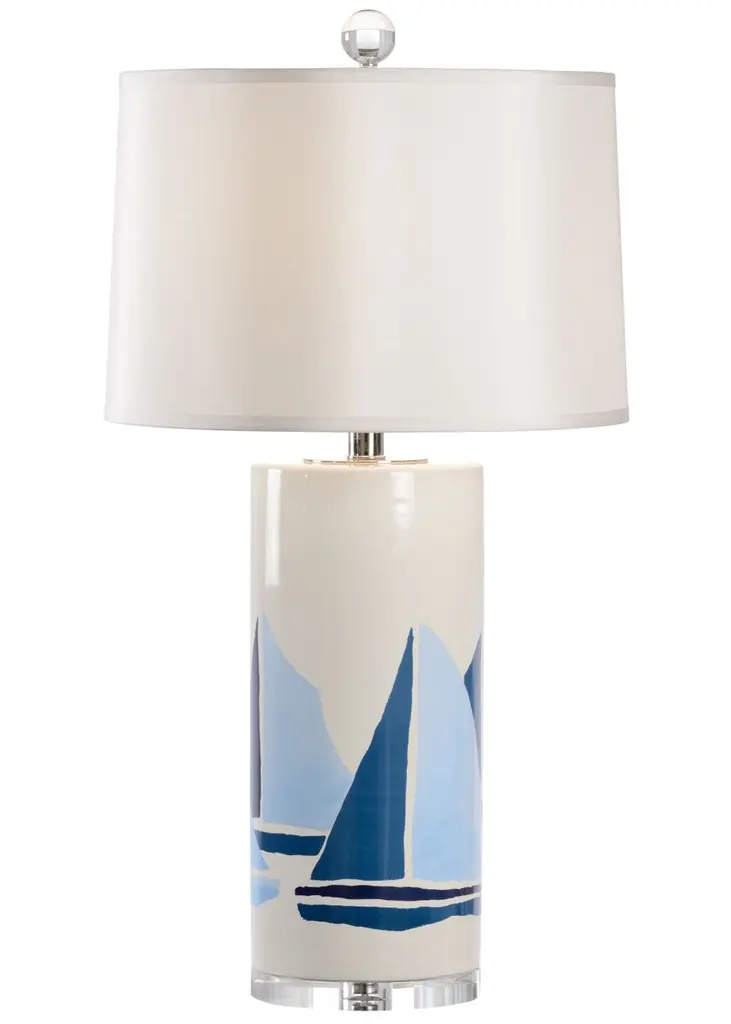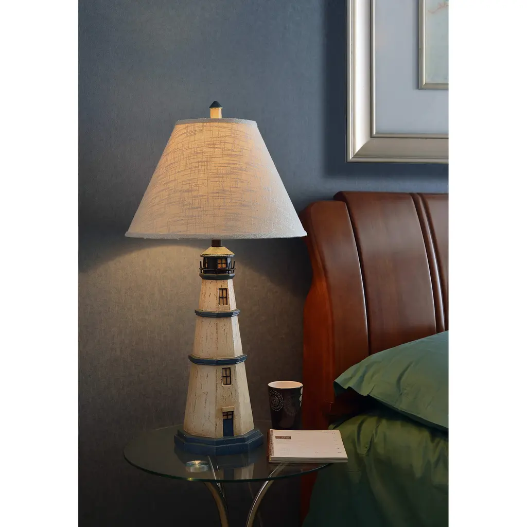 Seahaven Sky Blue Lighthouse Night Light Table Lamp 27" high, Round Hardback Linen Shade, 100w Max bulb (not included), 1 x Night Light, 1 x 6w Max Night Light bulb (included), Shade Dimensions: Top/Bottom/Slant: 7" x 18" x 11". Base of lamp 8"d