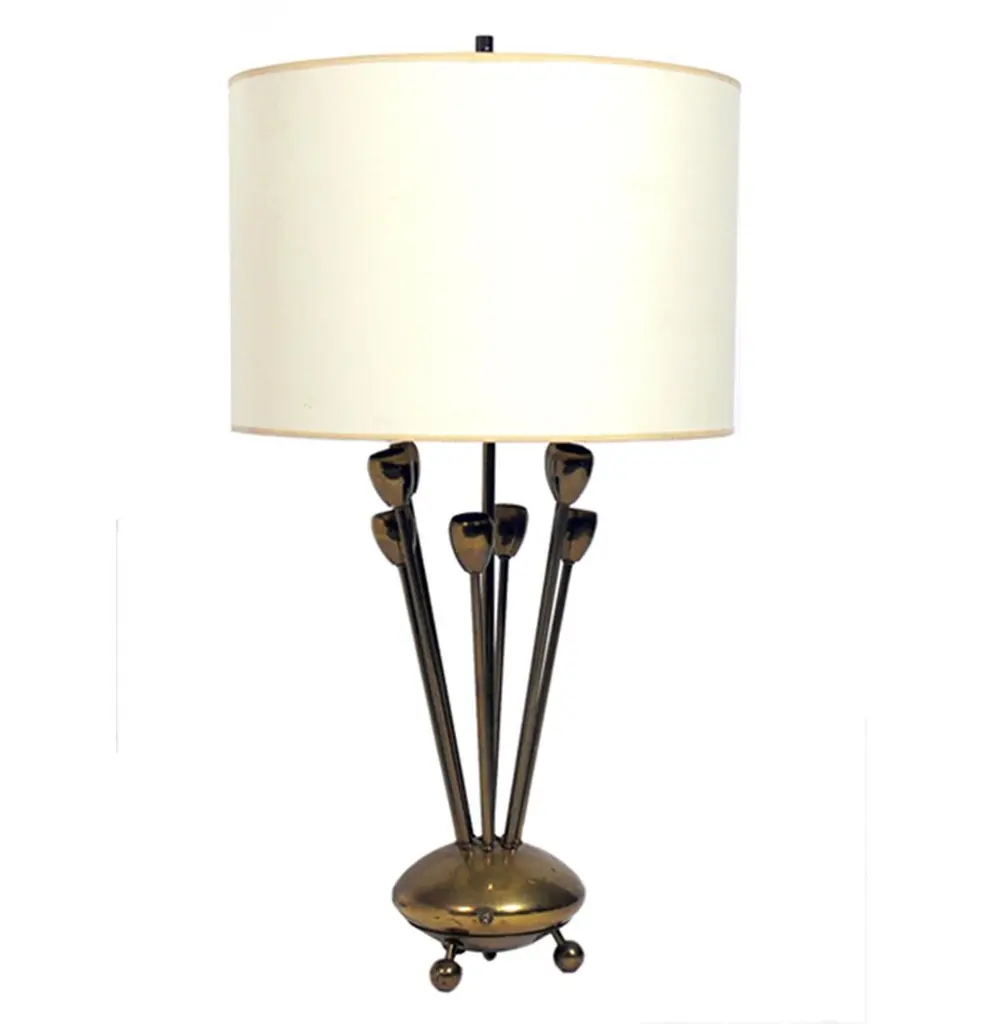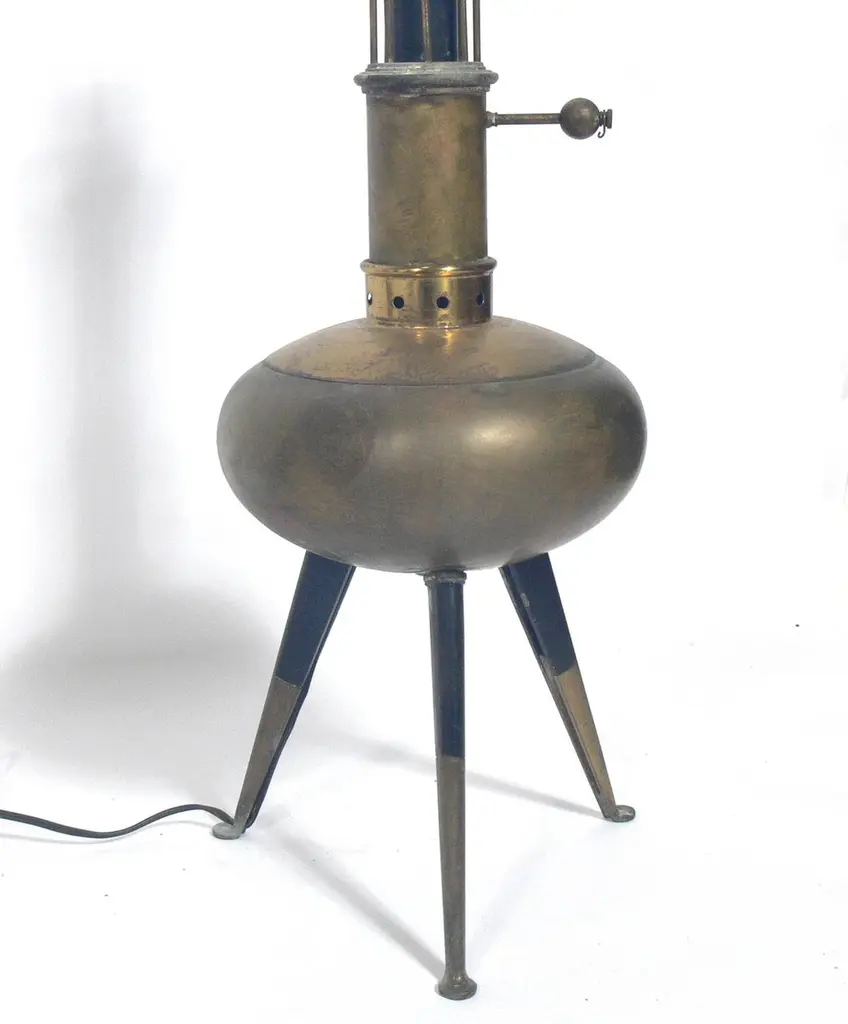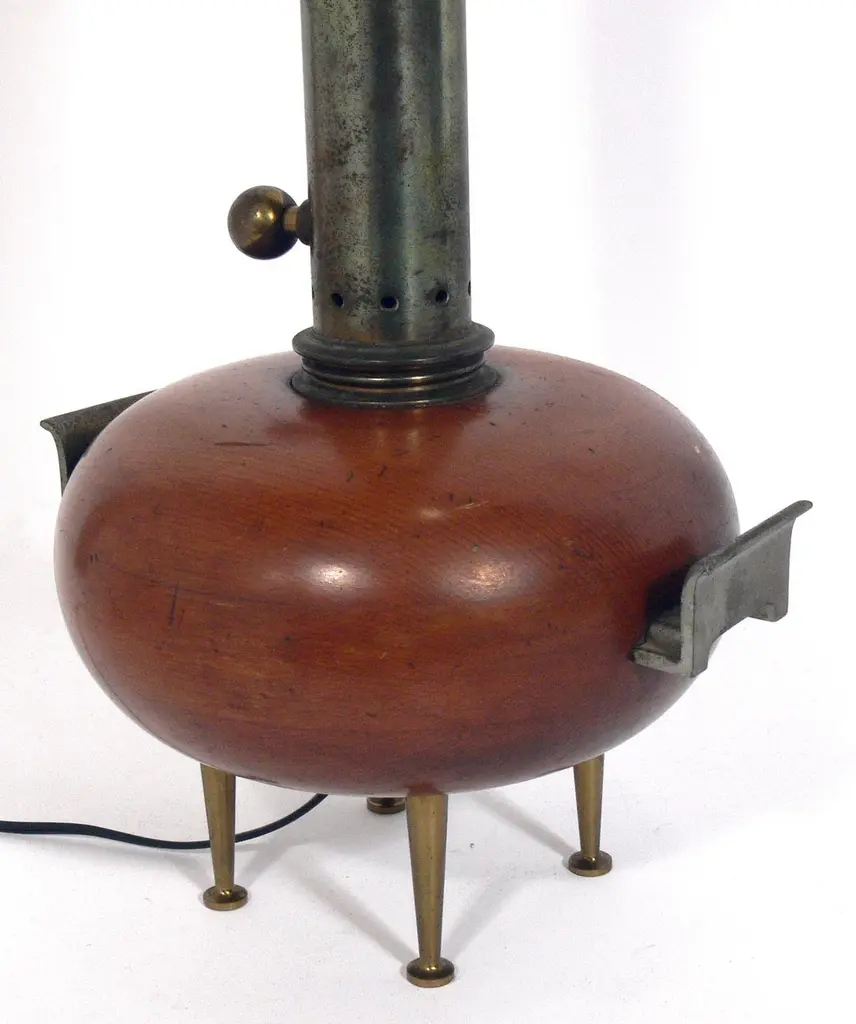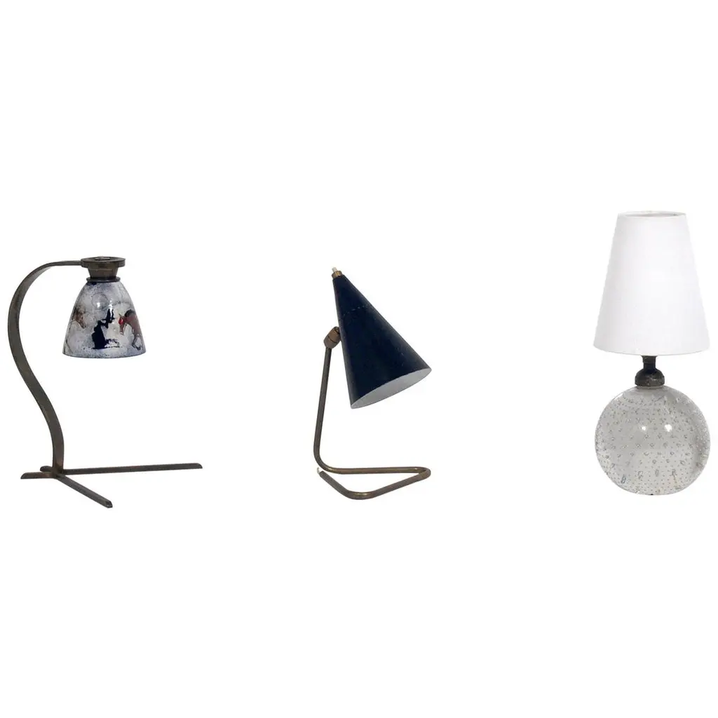 Selection of Italian midcentury lamps, Italy, circa 1950s.They are, from left to right in the first photo:1) Brass and wood lamp. It measures 37.5"H x 14"W.2) Brass and enameled metal lamp. It measures 37"H x 19"W3) Patinated brass tripod lamp. It measures 36"H x 17"W.4) Brass lamp. It measures 33.75"H x 19"W. They are priced at $1500 each. The price and measurements noted includes the shade. They have been rewired and are ready to use.