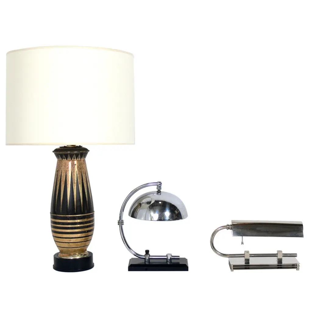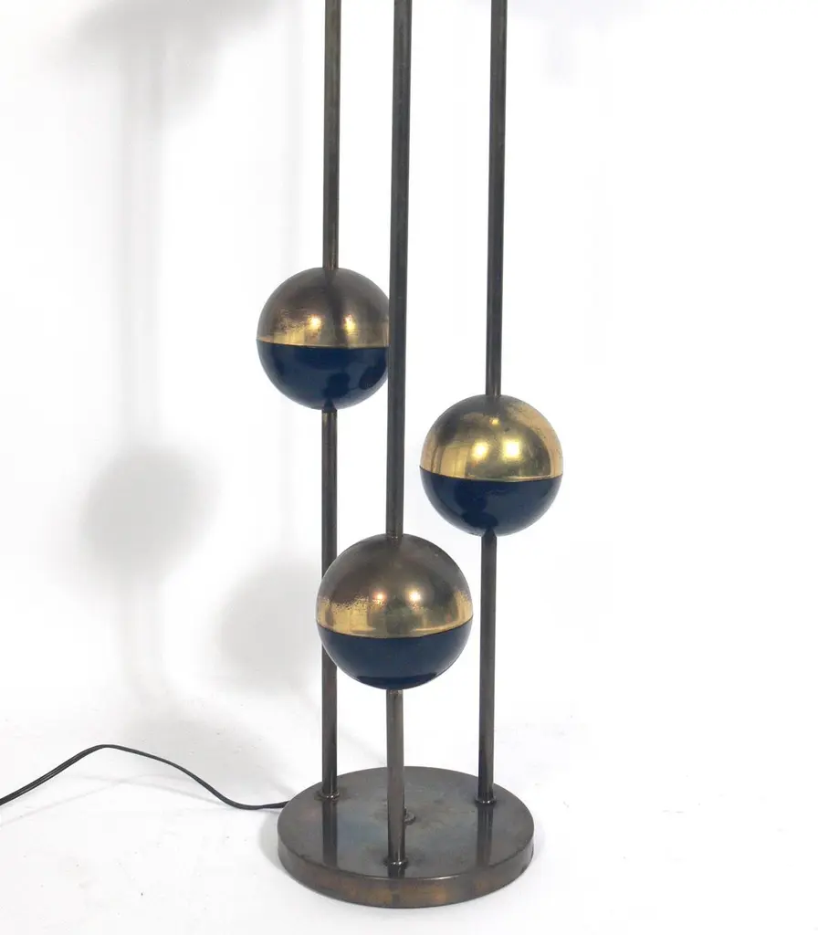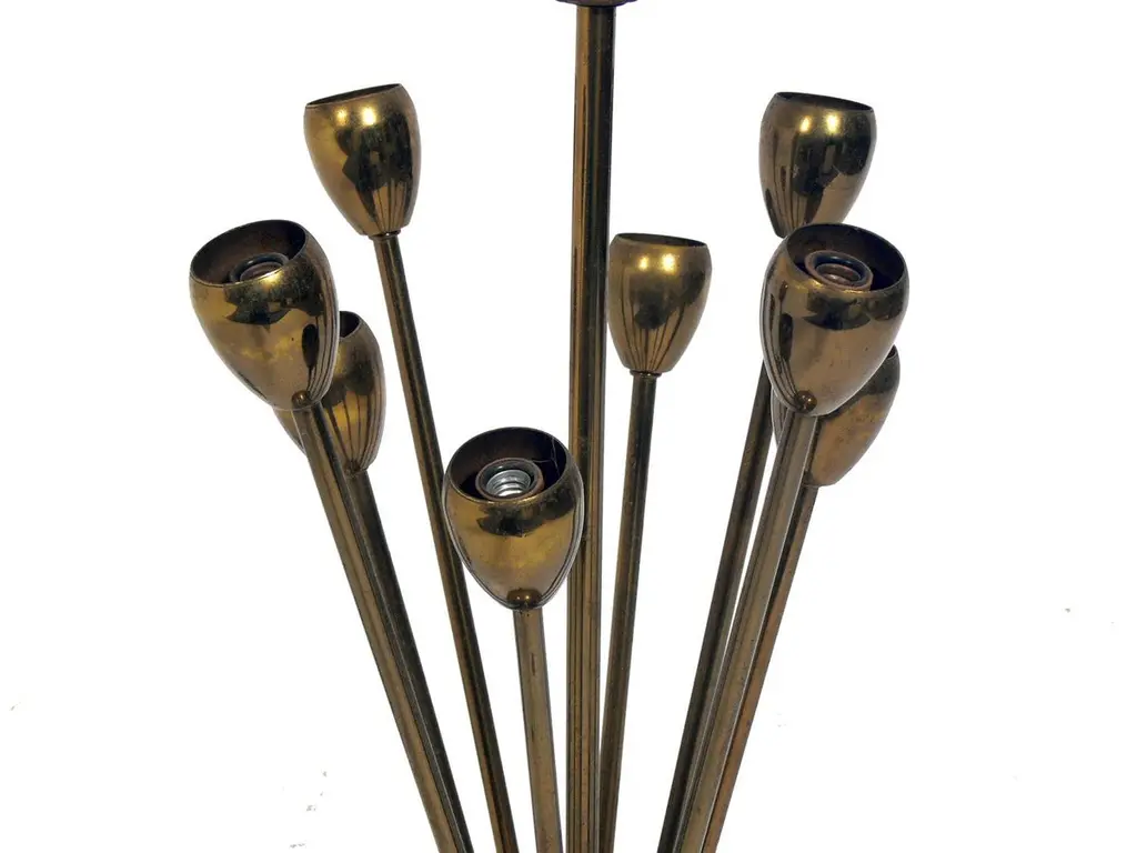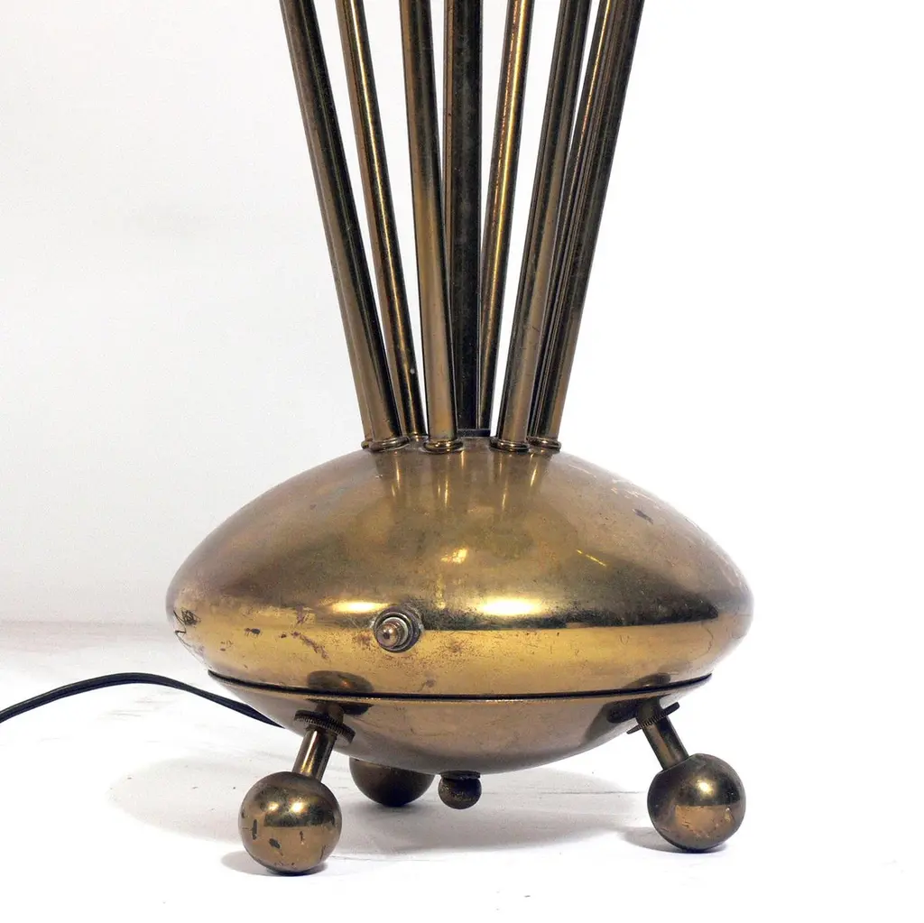 Selection of Italian midcentury lamps, Italy, circa 1950s.They are, from left to right in the first photo:1) Brass and wood lamp. It measures 37.5"H x 14"W.2) Brass and enameled metal lamp. It measures 37"H x 19"W3) Patinated brass tripod lamp. It measures 36"H x 17"W.4) Brass lamp. It measures 33.75"H x 19"W. They are priced at $1500 each. The price and measurements noted includes the shade. They have been rewired and are ready to use.