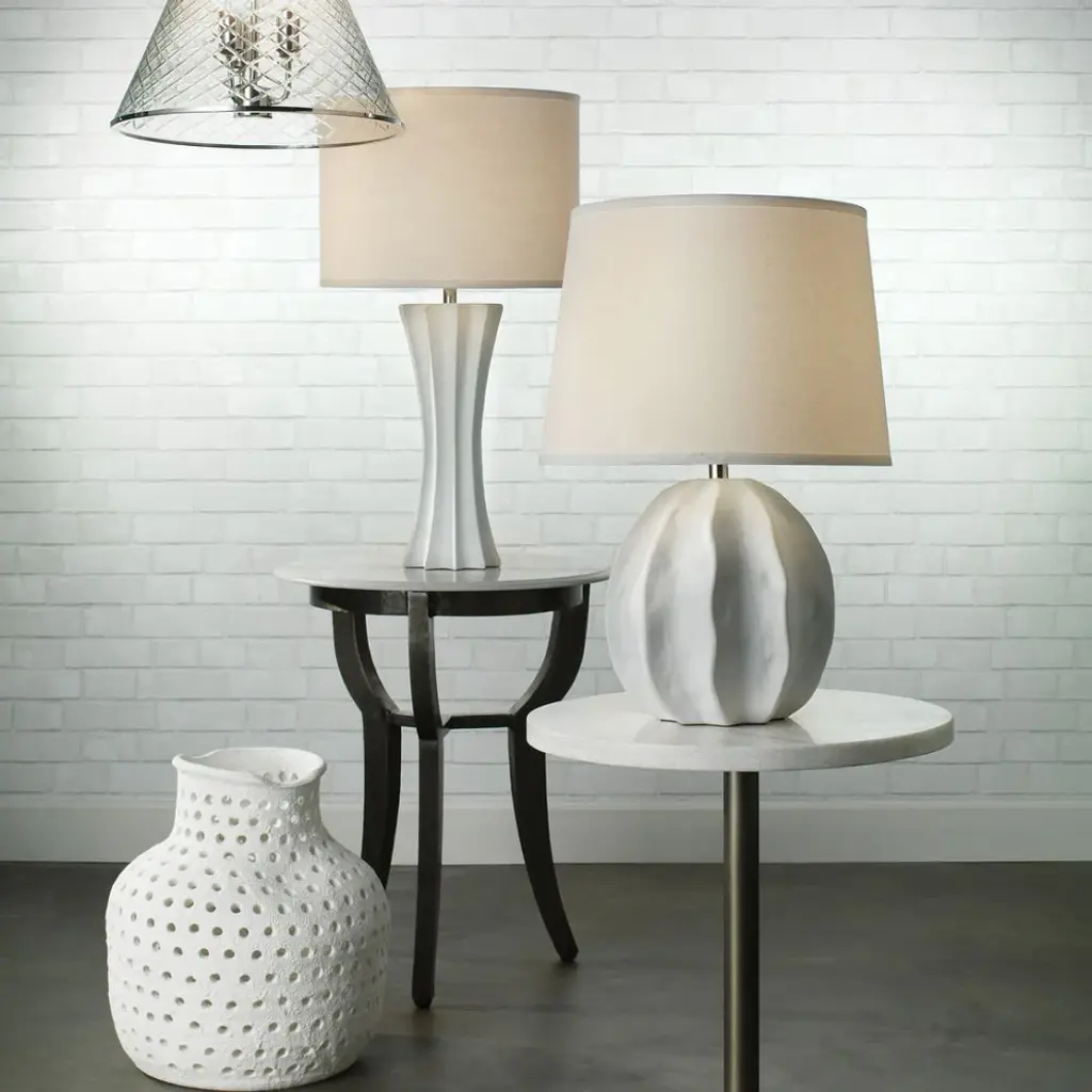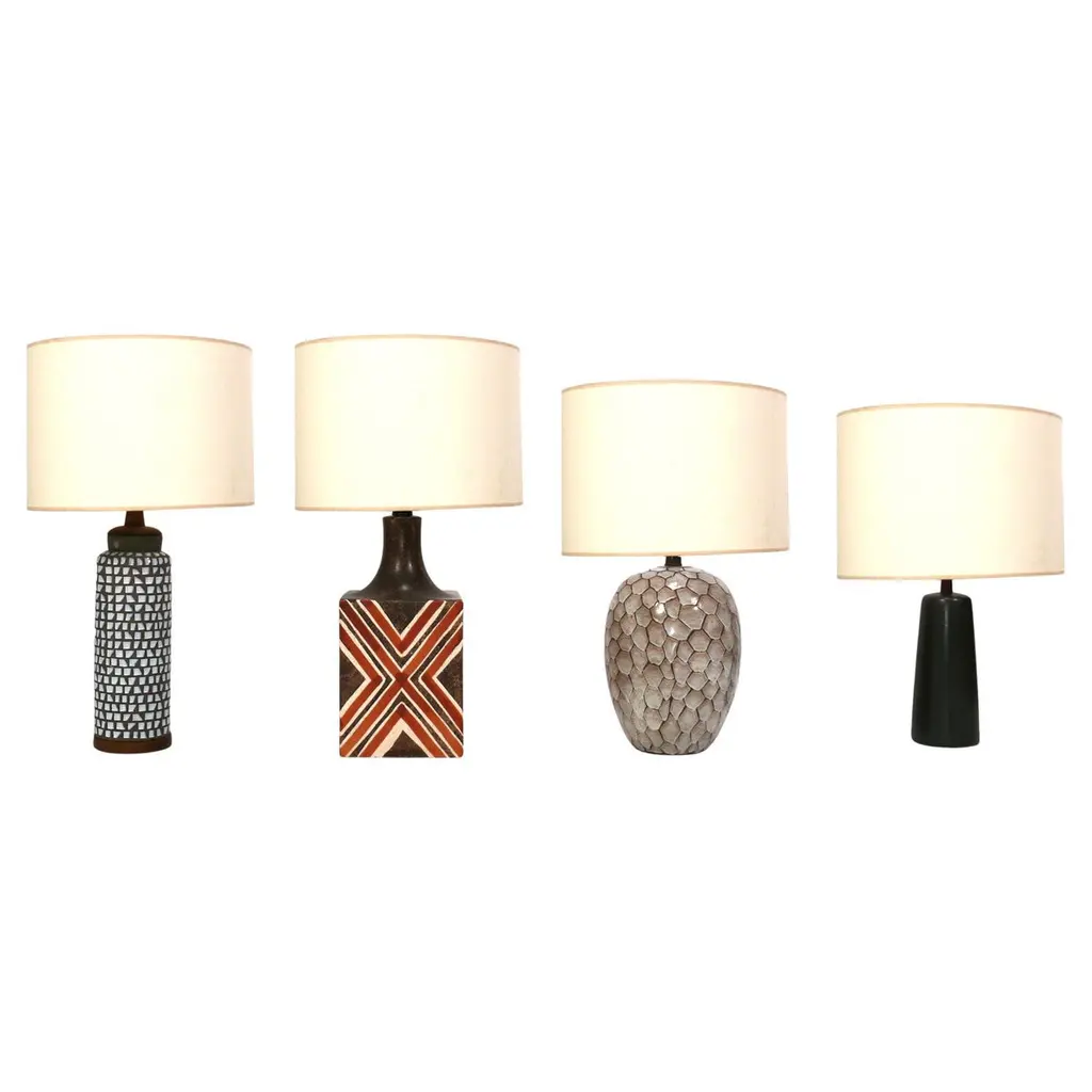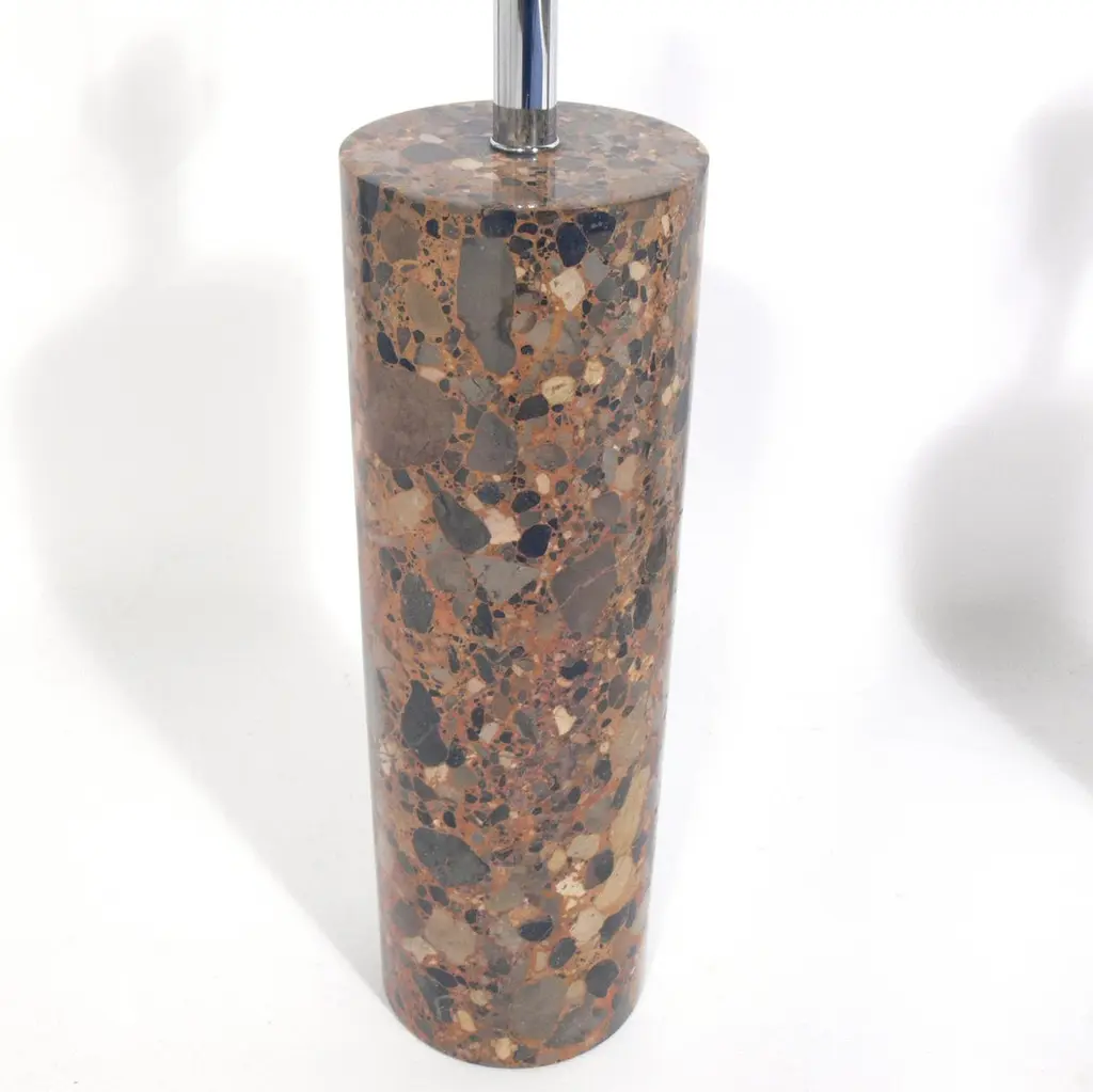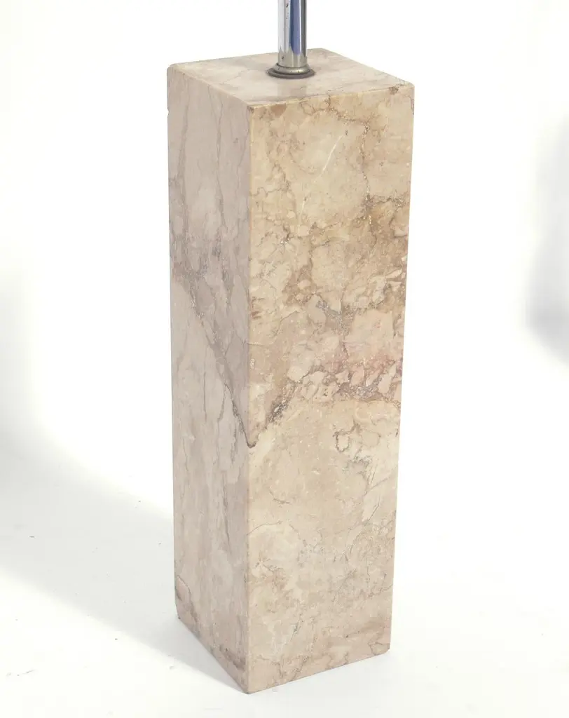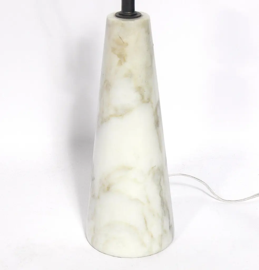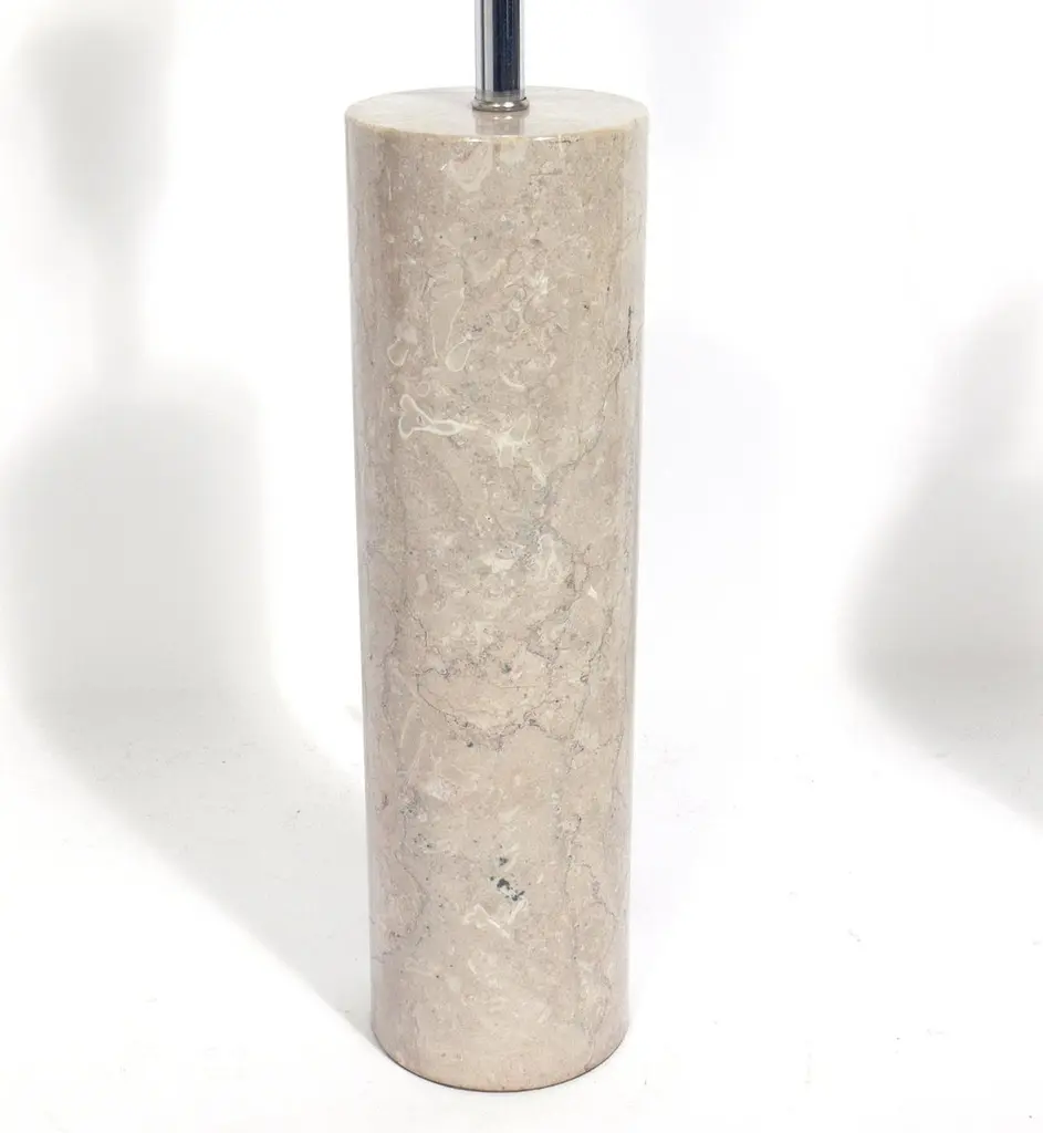 Selection of midcentury marble lamps, American, circa 1950s.From left to right in the first photo, they are:1) Variegated round marble lamp in grays, blacks, deep reds, and browns, chrome hardware, probably by Nessen Studios. It measures 36" H x 14" W.2) Round marble lamp in tans, greys, and whites, chrome hardware. It measures 33.5" H x 14" W3) Square marble lamp in tans and browns, chrome hardware. It measures 29" H x 12" W4) Conical marble lamp in whites, grays, golds, antiqued brass hardware. It measures 22" H x 12" W.They are priced at $550 each and the price and measurements noted include the shade. They have all been rewired and are ready to use.