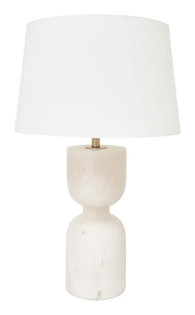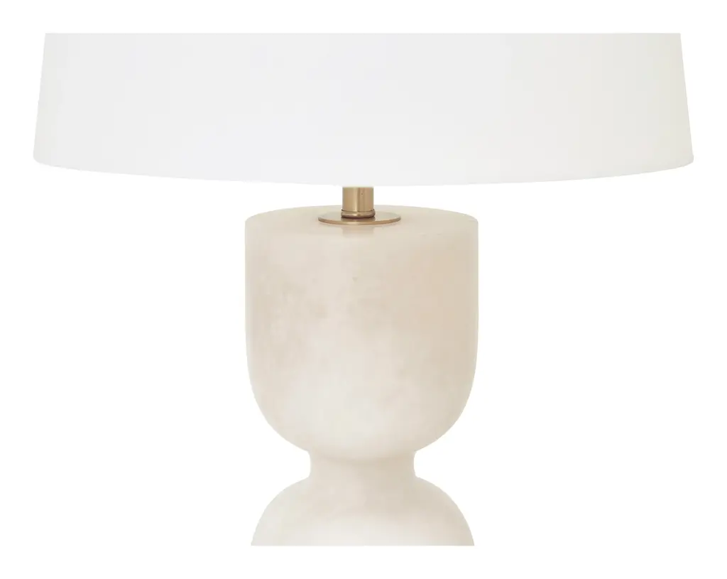 Cast a glow on your space with our stunning Selene Lamp. Elegant in its simplicity, this table lamp is crafted from a solid block of natural alabaster stone, carved into a sleek, stately silhouette. We’ve paired this organic base with a classic white linen drum shade and bright brass details for just the right amount of structure and shine. A beautiful addition to any room of the house, we think Selene would be especially lovely illuminating a side table or nightstand. •natural alabaster stone•white linen shade•brass finial•8' sand-colored cloth cord •3-way cast turn knob•requires 150W max/type A bulb Dimensions •15" diameter x 25"H•base: 5.5" diameter x 13"H•shade: 13.25" top diameter x 15" bottom diameter x 10"H