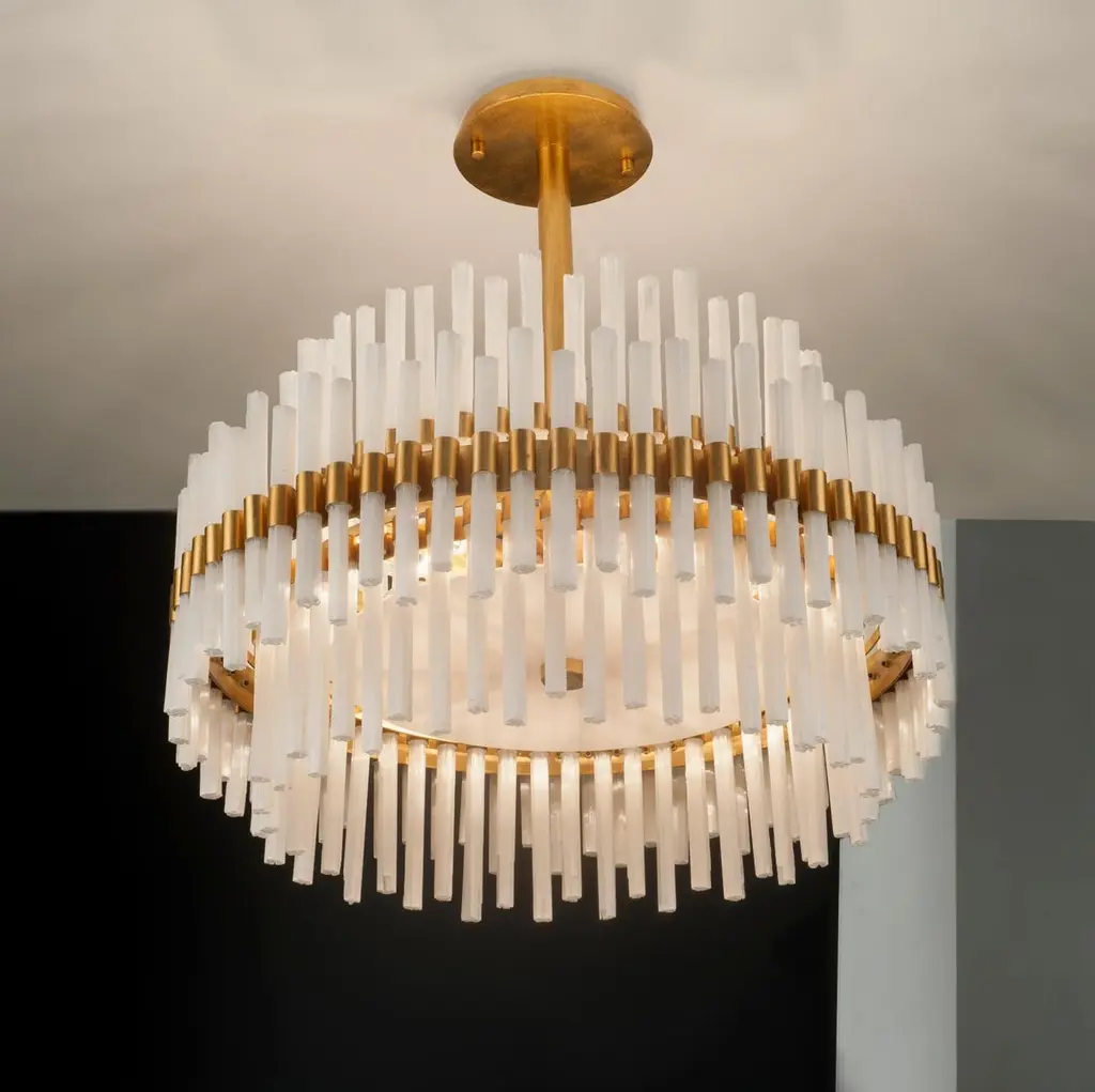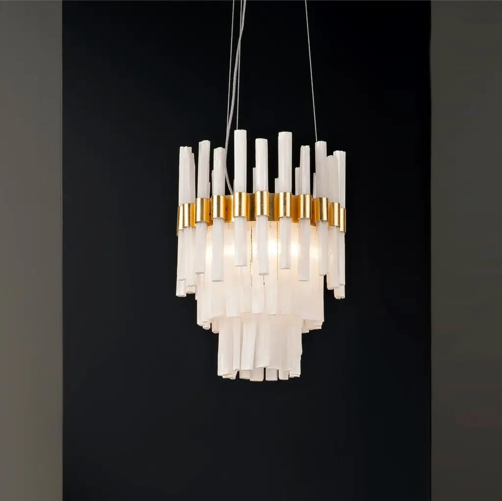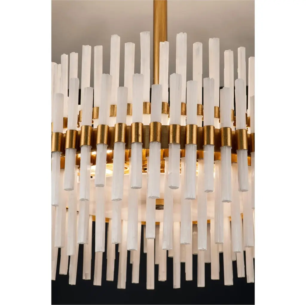 Selenite chandelier lamp by Aver Dimensions: Diameter 84 x H 50 cm Materials: Aluminum plated with Gold Leaf. Natural Selenite. Lighting: 12 x E14Finish: Silver Veneer, Aged Silver Veneer, Gold Veneer, Aged Gold Veneer, Copper Veneer, Aged Copper Veneer, Aged Gold Patina, Antique Patina.Crystals: Moroccan Rock.Also available in size Small (D35 cm). All our lamps can be wired according to each country. If sold to the USA it will be wired for the USA for instance.Pendant with an outer layer of cut selenite rods. Its interior is filled with the same rock in two layers.The history of Aver Metais as a lighting brand begins with Jefferson Aver manufacturing lamps in a completely handcrafted way and with very few resources in the family business. Over the years, the brand has grown and gained recognition. Today, our products are present in several projects by prestigious professionals, in addition to being resold in lighting boutiques in different regions of Brazil. Through its partners, Aver Metais has several participations in important design and architecture exhibitions. In 2015 the company started its internationalization process and today has clients and projects carried out in places like New York, Los Angeles, Chicago, Dallas, Miami, London, Cardiff, Hamburg, Manila, Santa Cruz de la Sierra, and Lima, attesting to the level quality and competitiveness of Aver Metais products.In our factory, each piece is meticulously produced using modern production processes combined with craftsmanship to detail. The result is original pieces that, more than illuminate, are jewels for your home. Over the years, the brand has been dedicated to creating and producing original and high-quality decorative lighting fixtures that can fit into the most varied and demanding interior architecture projects.