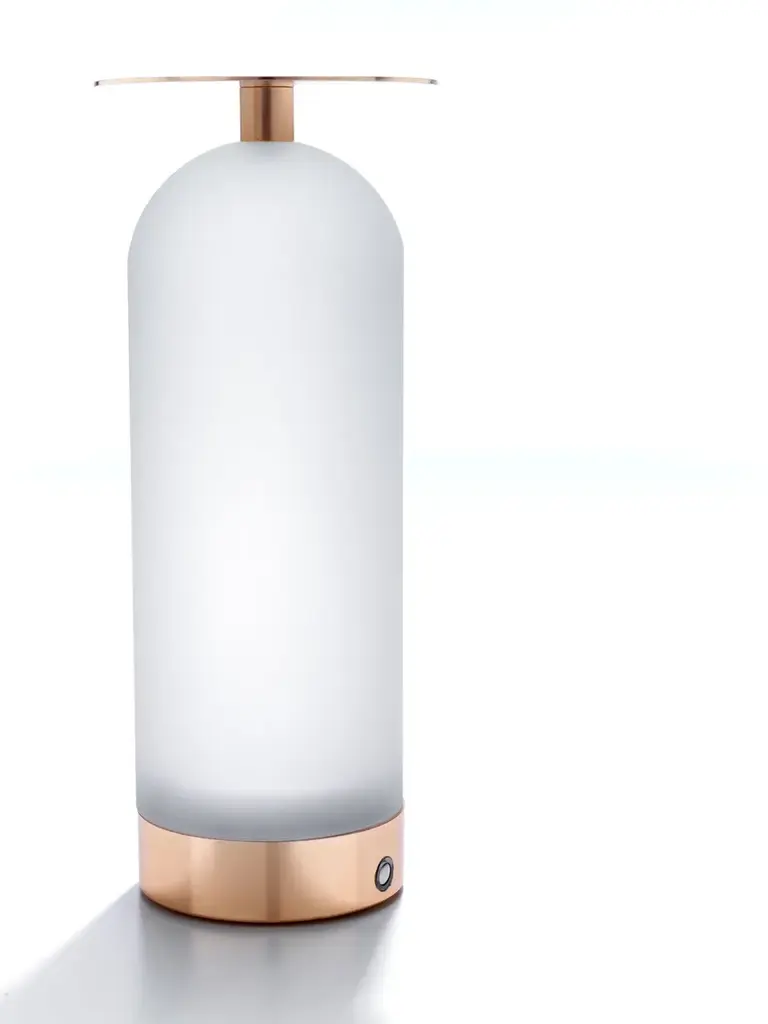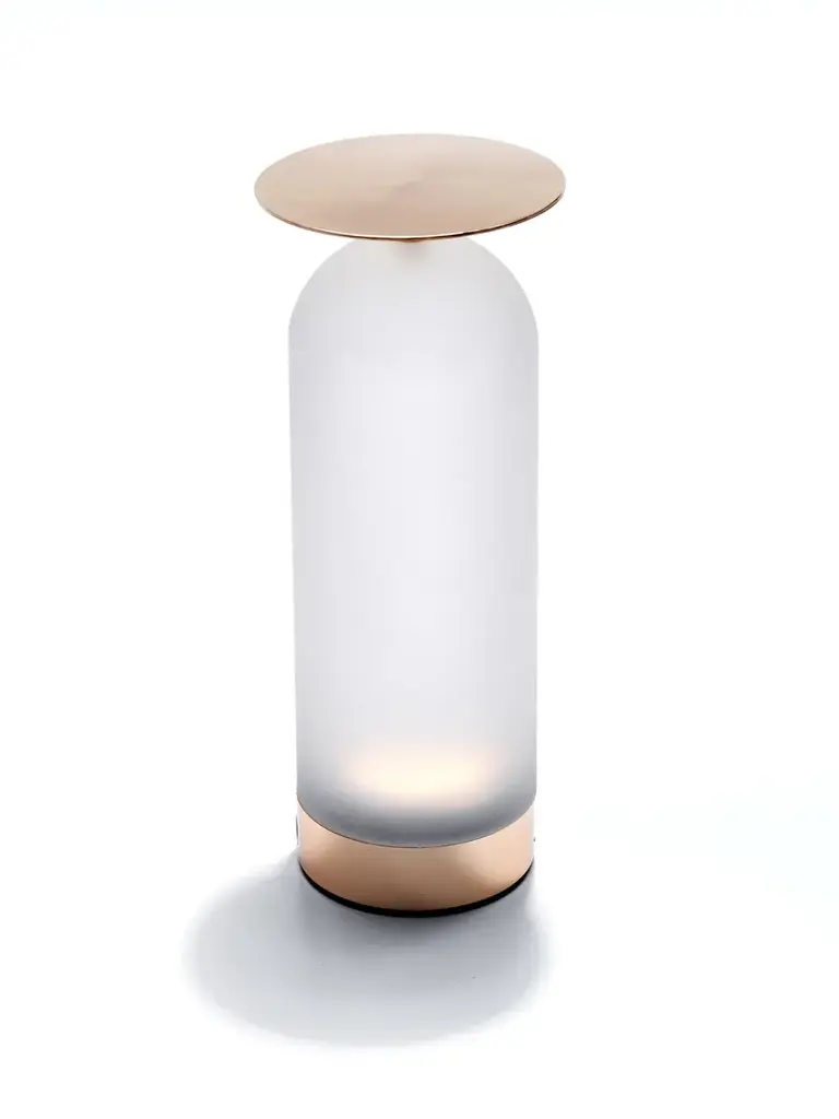 Stylish and discreet, nearly shy, make this lamp stand out, inspired by typical glass bottles. The lamp S’ENZA, with his satin glass body, is integrated at its edges with aluminium parts: a supporting ring in the base and a disc on the top, recalling a protection roof.Dimensions: H.25 cm. Top plate Ø12 cm. Base Ø 8 cm. H.2,5 cm.Power consumption: 3W.Net weight: 1,6kg.
