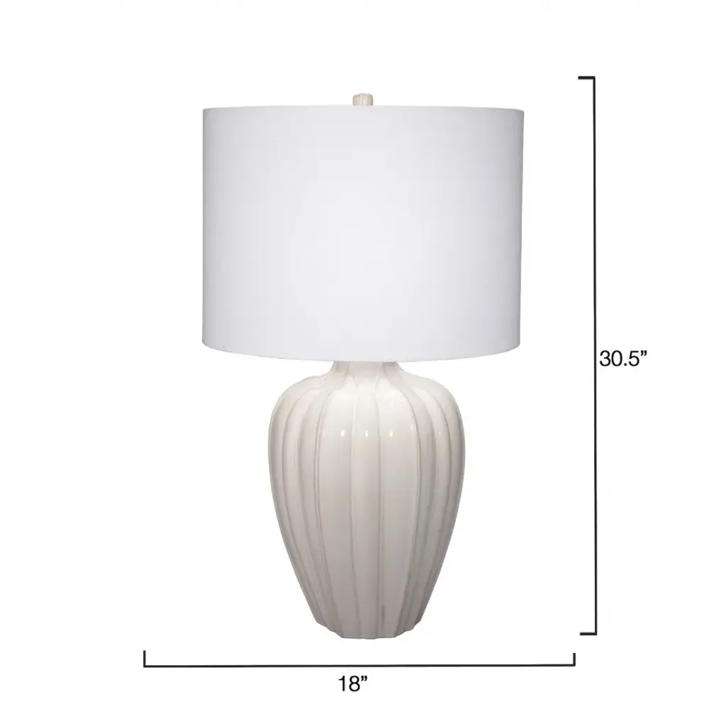 With its casually elegant cream palette, this table lamp can brighten any room even before it is switched on! The ribbed base is expertly handcrafted of cream ceramic, as is the coordinating finial. The drum shade is in white linen. This is a particularly pleasing style choice when placed against richly polished wood.