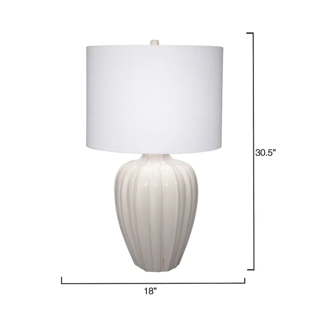 With its casually elegant cream palette, this table lamp can brighten any room even before it is switched on! The ribbed base is expertly handcrafted of cream ceramic, as is the coordinating finial. The drum shade is in white linen. This is a particularly pleasing style choice when placed against richly polished wood.