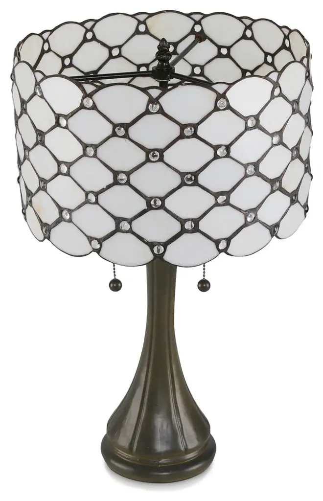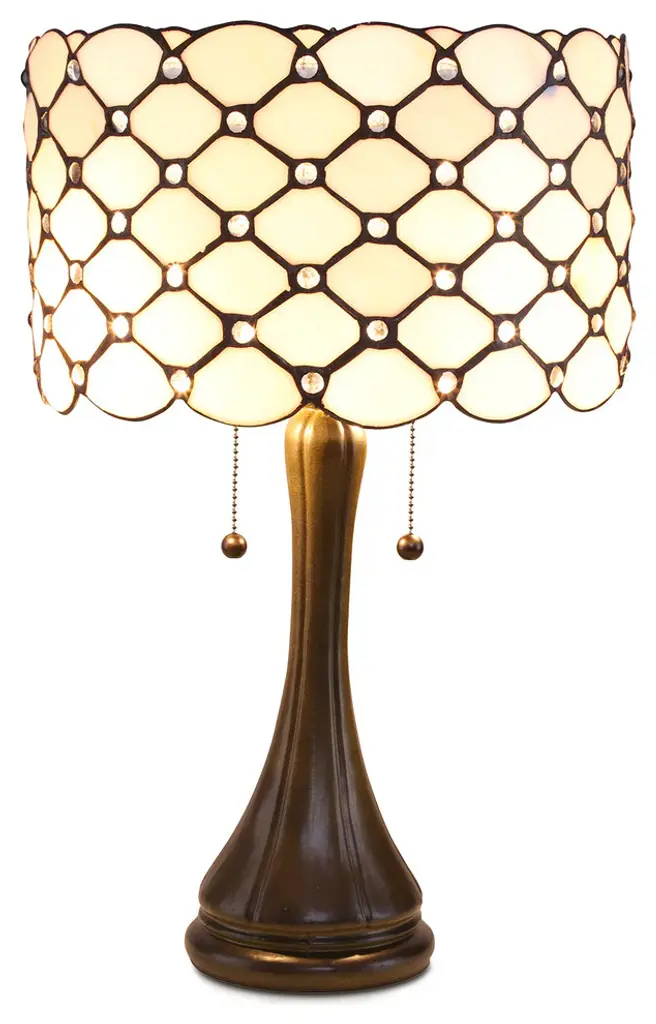 This unique Jeweled Table Lamp has a contemporary look and has been handcrafted using methods first developed by Louis Comfort Tiffany. The shade contains pieces of stained glass, each hand-cut and wrapped in fine copper foil and fits perfectly in any room or office. This lamp has jeweled accents on the shade to create a stunning addition to your decor.Bronze metal base adds to the contemporary look of the lampThe lamp is 23" tall x 14" in widthEasy to use 2 pull chains for on/off lighting. Uses two 60-Watt bulbs and can use CFL or LED bulbs. Bulbs not included. UL listed.