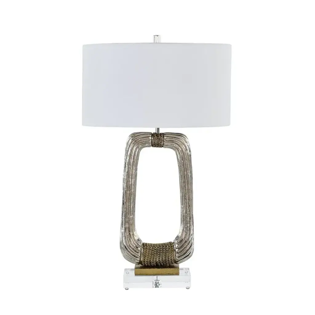 The Serengeti Table Lamp is a gorgeous design that is brimming with rich visual depth. This aluminum piece in a Nickel finish displays a rectangular shape with curved edges, punctuated with dimensional grooves. Gorgeous brass chain links accent the top and bottom of the lamp, masterfully blending warm and cool metallic tones. The piece rests atop a square acrylic base and features a faceted finial in Nickel. The look is completed with Nickel hardware and a white drum shade with rolled edges.