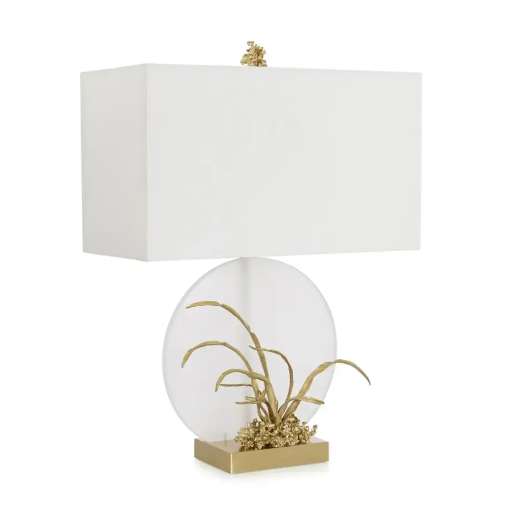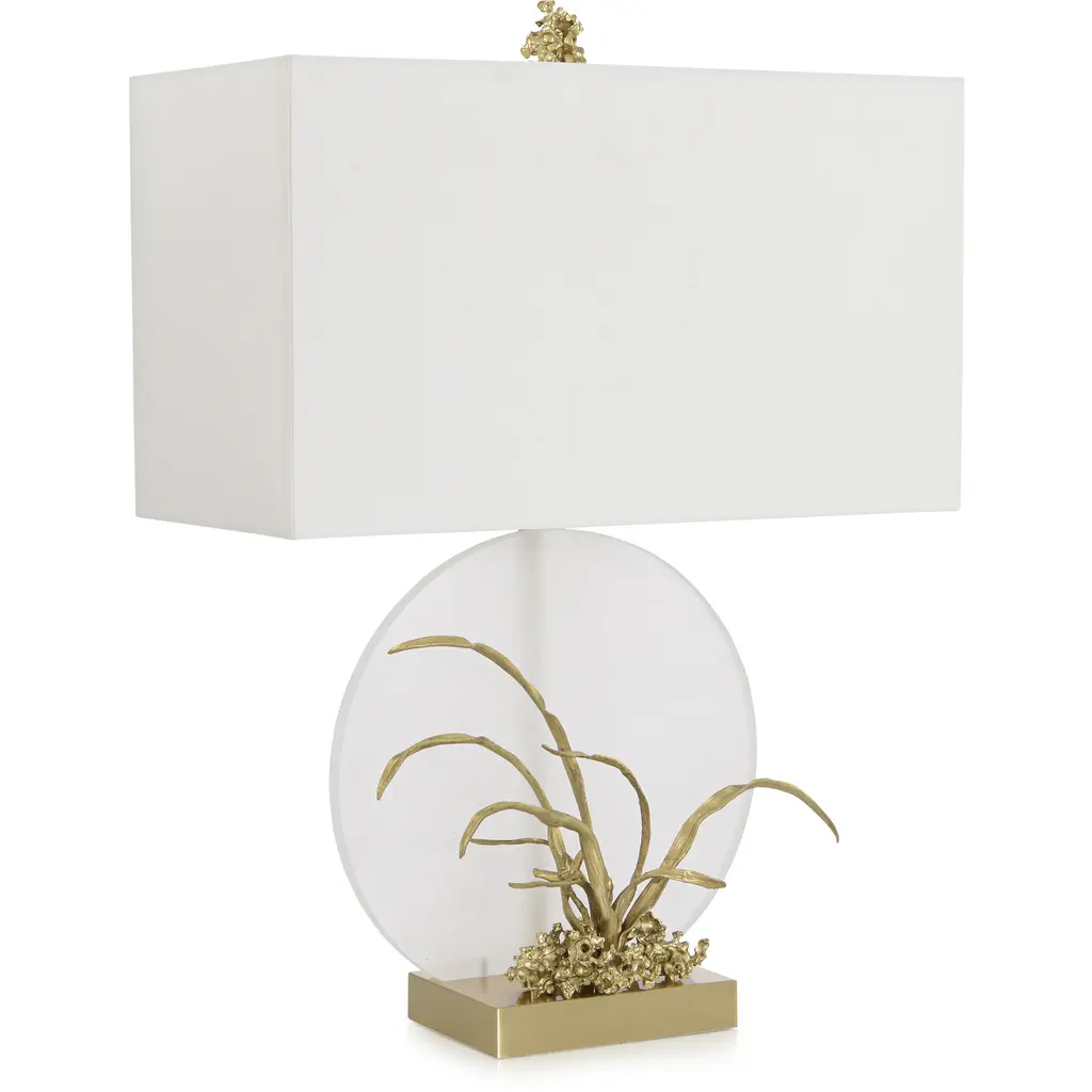 The Serenity Table Lamp is a stunning natural motif translated through the lens of modern design. The piece showcases a gorgeous plant crafted from polished brass that rests in front of a rounded cut of frosted acrylic. A square brass base and matching finial with an organic shape beautifully compliment the flora to complete the look of this three-way turnkey lamp.
