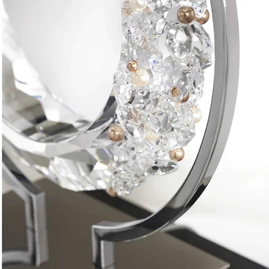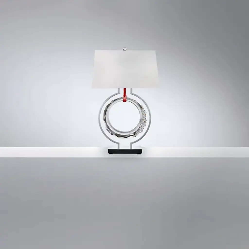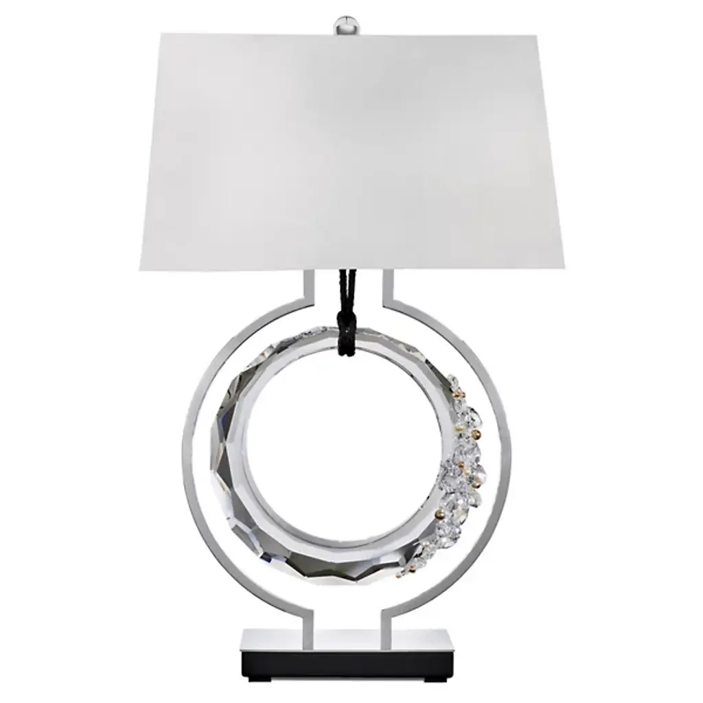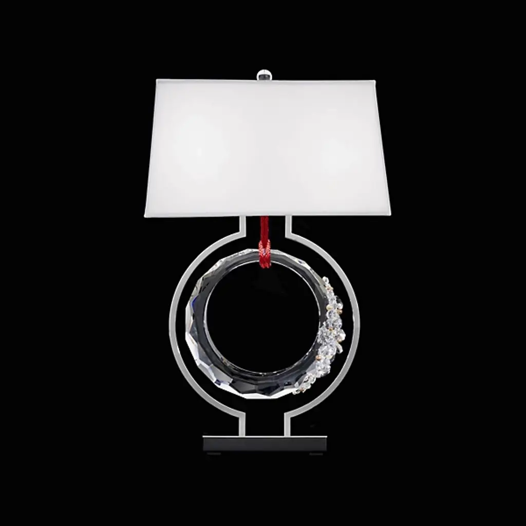 The Serenity Table Lamp from Schonbek Forever features captivating elegance with a sparkling faceted ring at its core. Twinkling Schonbek Radiance crystals, embellished with lustrous Swarovski pearls, tastefully wrap one edge of the design, creating an absorbing play of light. This tabletop luminaire is an astounding and effortless treasure, inviting you to cherish and enjoy its enchanting presence. Constructed with precision from a combination of steel and aluminum, this table lamp features a fabric shade with an embossed Schonbek logo, complemented by a luxurious braided nylon rope suspension.