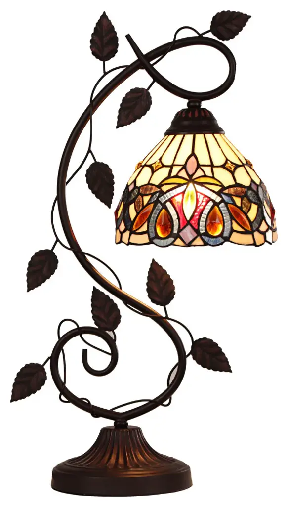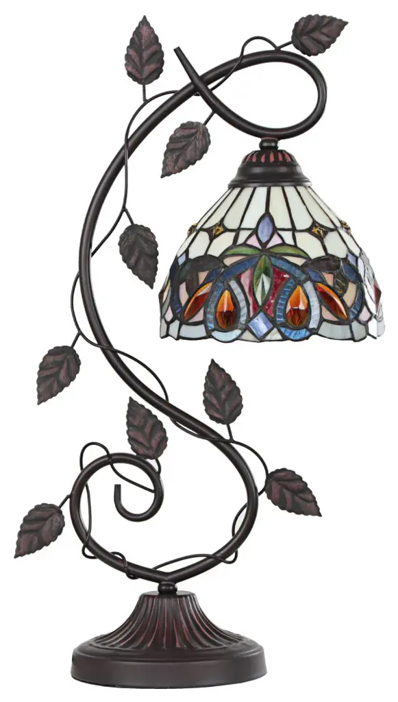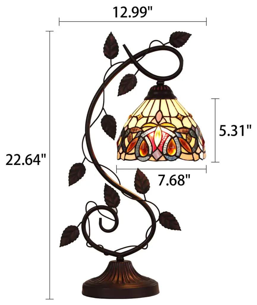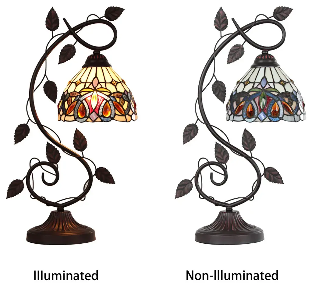 Serenity is a stunning 1 light mini table lamp, featuring a beautiful vine base and a victorian shade. This piece would be perfect as a bedside lamp, or an accent lamp in a foyer. Each shade is hand crafted, using the same methods developed by Louis Comfort Tiffany in the early 1900''s. This process entails using 162 hand cut stained art glass pieces and 21 crystals, each wrapped in fine copper foil and soldered together at extremely high temperatures to form each unique piece. Exact size to the nearest inch may vary, and exact color of each glass piece may vary due to each piece being hand crafted. First image is with the light shining through, second image is with no light. Dry listed and recommended for an indoor setting.