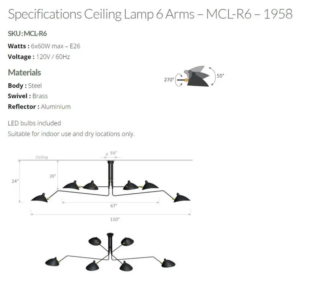 Impressively large, this six arm ceiling lamp is a Mouille classic. Tilting and rotating heads with rotating arms of 31 and 54 inches make this fixture a truly spectacular statement in a large room.Available in black, white or both. Brass swivels connect the shades. The arms have brass stops.COLOR OPTIONAvailable in Black or WhiteFEATURESIn neutral setting, the lamp is perfectly symmetrical, the 2 long arms being diametrally opposite, and so are the 2 other pairs of short arms. All 6 arms rotate on a horizontal plan, which makes this lamp highly versatile (it can be mounted in the corner of a room to give a general lighting plus a specific lighting to a dining table for example). Yet it is most often used as a center piece, in its symmetrical configuration.CUSTOMIZATIONCustomization possible for the pendant and arm's lengths. Arm length = from vertical line of the pendant to the tip of the shade.Pendant = from the ceiling to the lowest part of the pendantSWITCH OPTIONSThe 6 Arm Ceiling Lamp is hardwired. The 6 light bulbs are controled together from the same wall switch.Best fit dimmable LED bulbs providedWHAT SETS US APART? - Technical expertise - Full line of products - Availability - Customization - 5 year guarantee - Secured shipment - Small Repairs - After sale service - Experience (we introduced these lamps to the US, 23 years ago).WHAT TO LOOK OUT FOR:- No expensive international shipping, - No Customs fee- No deadlineAll lamps have been thoroughly inspected with our 44 check points upon arrival, which gives us the confidence to offer a 5-year guarantee to our clients.