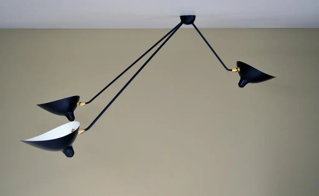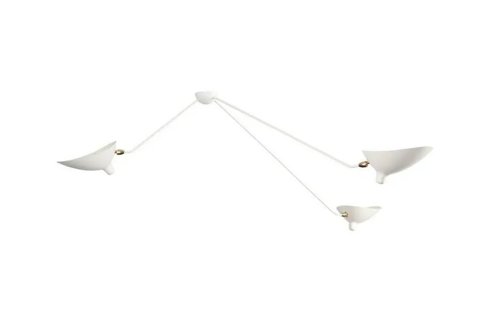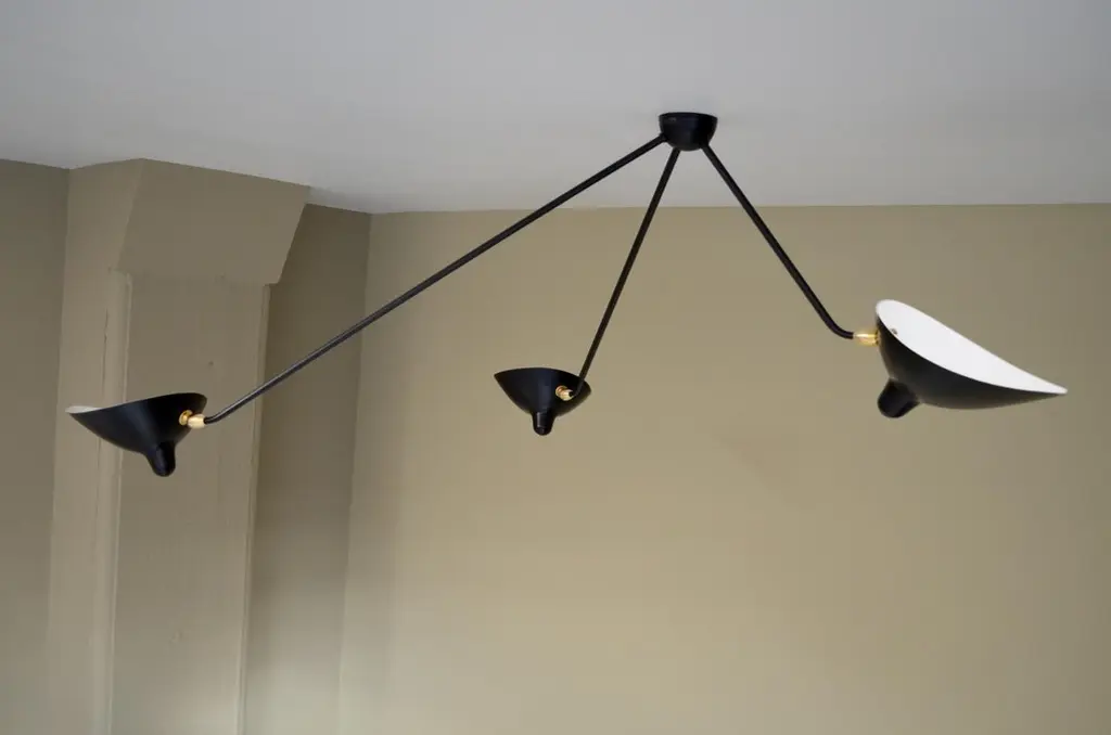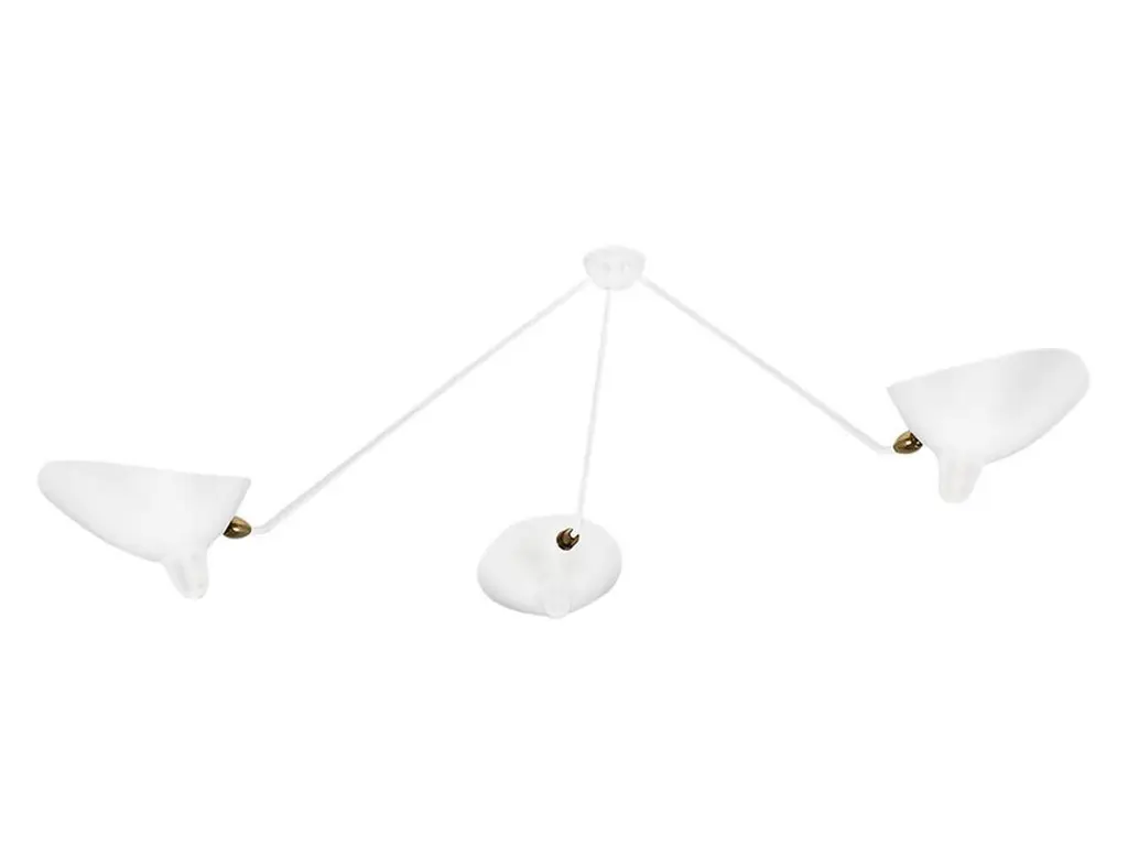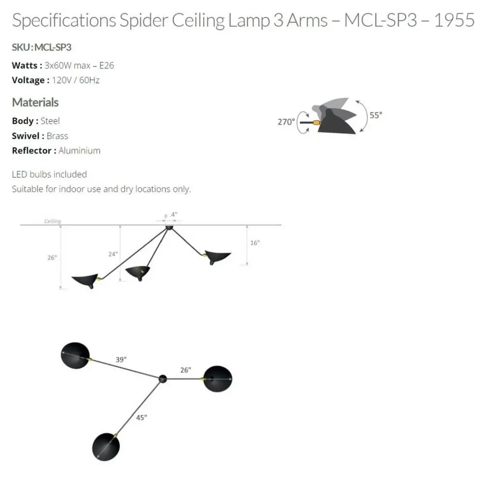 A slight angle at the end of each arm allows this classic design to be equally at home on the ceiling. With rotating heads on fixed arms, its beauty only rivals the versatility.Available in white or black. Brass swivels connect the shades.COLOR OPTIONAvailable in Black or WhiteFEATURESThis lamp is asymmetrical like all spider lamps, ceiling, or wall fixtures. The arms do not swivel, do not rotate, do not extend, or retract. They are perfectly still. Only the shades rotate and swivel.CUSTOMIZATIONCustomization possible for the arm's lengths. Arm length = from vertical line of the pendant to the tip of the shade.SWITCH OPTIONSThe 3 Arm Spider Ceiling Lamp is hardwired. The 3 light bulbs are controled together from the same wall switch.Best fit dimmable LED bulbs providedWHAT SETS US APART? - Technical expertise - Full line of products - Availability - Customization - 5-year guarantee - Secured shipment - Small Repairs - After-sale service - Experience (we introduced these lamps to the US 23 years ago).WHAT TO LOOK OUT FOR:- No expensive international shipping, - No Customs fee- No deadlineUpon arrival, all lamps were thoroughly inspected with our 44 check points, which gives us the confidence to offer our clients a 5-year guarantee.