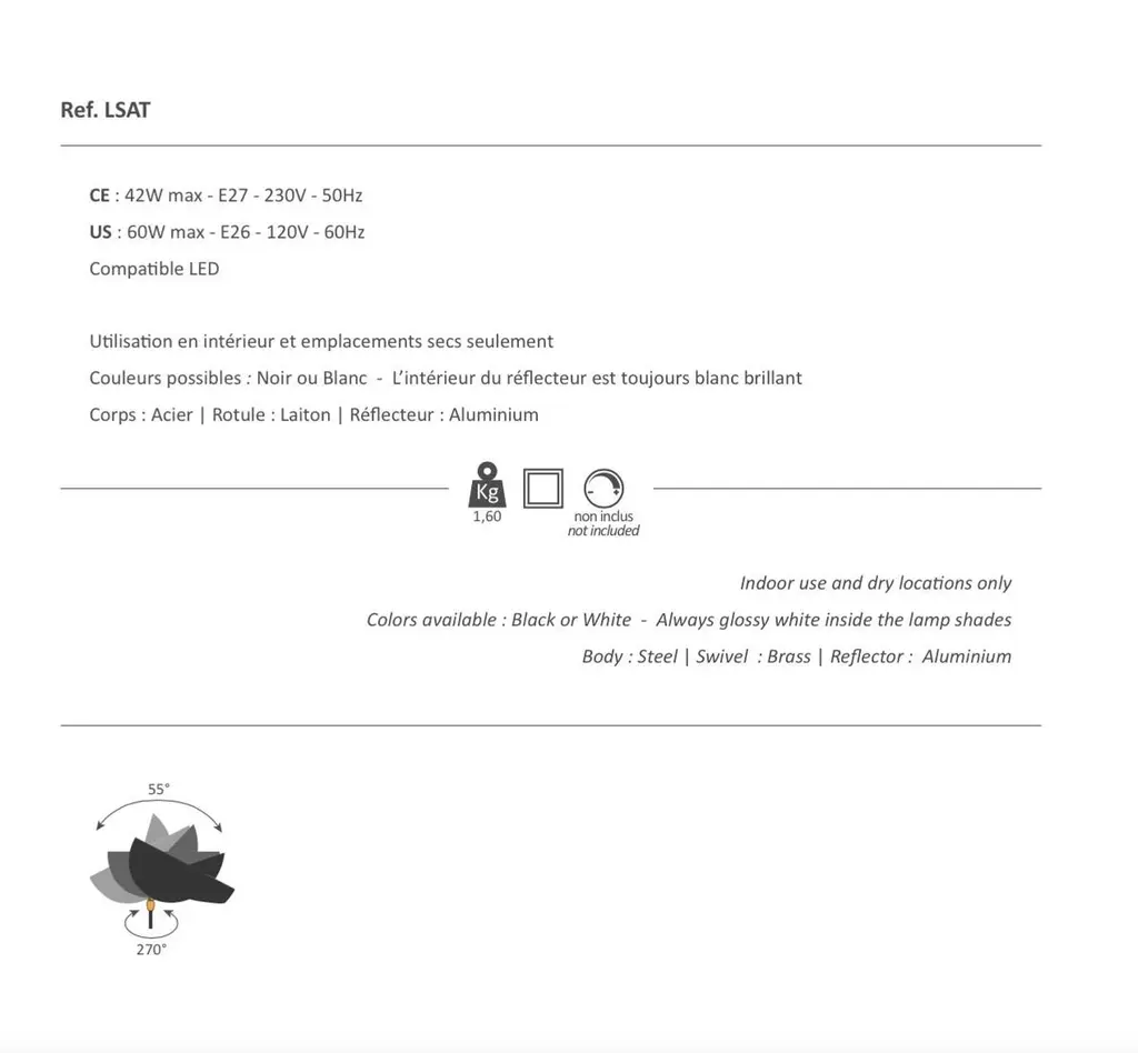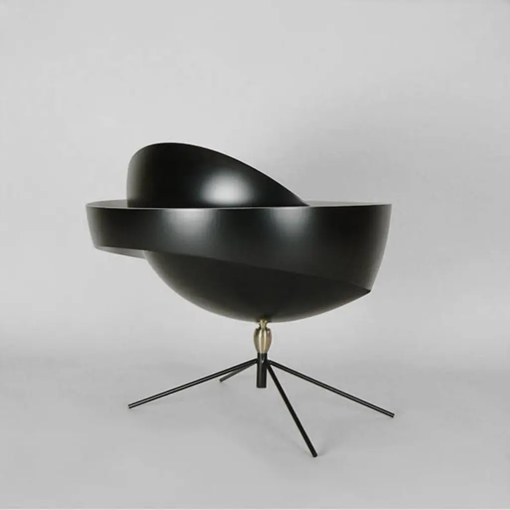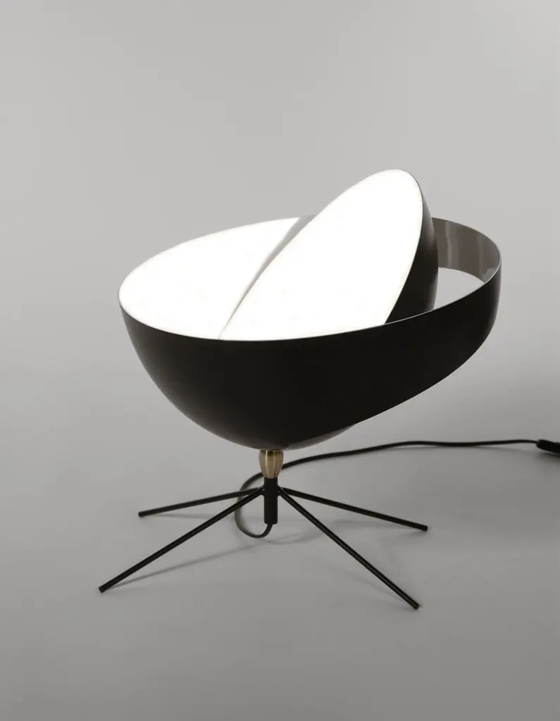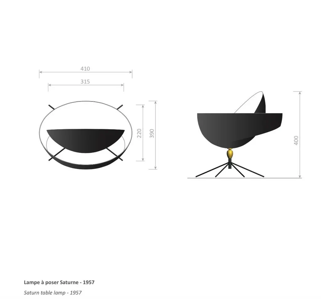 Table lamp model 'Saturn Table Lamp' designed by Serge Mouille in 1957.Manufactured by Editions Serge Mouille in France. The production of lamps, wall lights and floor lamps are manufactured using craftsman’s techniques with the same materials and techniques as the first models.Each lamp has a personal serial number and a specific certificate of authenticity when delivered. Materials and color:Body : Steel swivel : Brass reflector : AluminiumBlack lacquered - Always glossy white inside the lamp shades.This model is also available in white.Dimensions:H 15.75 in. x W 15.36 in. x D 16.15 in.H 40 cm x W 39 cm x D 41 cmTechnical details:CE : 42W max - E27 - 230V - 50HzUS : 60W max - E26 - 120V - 60HzIndoor use and dry locations only.Serge Mouille (24 December 1922-1988) was a French Industrial designer and goldsmith. He is best known for his light fixture designs. After having worked a few years in the workshop of Gabriel Lacroix, he opened his own workshop in 1945 with the intention of creating silverware utensils.In 1953 he began researching and designing light fixtures. During this period he was also supervising the gold smithing department at l'École des Arts Appliqués. In 1955 he was inducted into the Société des Artistes Décorateurs ("the Interior Decorators' Society").The following year, Steph Simon opened a design gallery at 145 Bd St Germain in Paris. Displaying the work of Charlotte Perriand and Jean Prouvé, the gallery soon also featured the work of Serge Mouille, Isamu Noguchi and Jean Luce. The designs of these artists soon become more widely known thanks to orders placed by institutions such as, Cité universitaire d’Antony, University of Strasbourg, University of Aix-Marseille and Centre d’essais en vol de Brétigny. Serge Mouille suffered from tuberculosis for many years and in 1959 he was forced to suspend his design activities and undergo treatment. In 1961, thanks to the Société de Création des Modèles, he was able to exhibit his latest light fixture designs at the trade show Salon des arts ménagers. These designs combined the concepts of fluorescence and incandescence. Production of his light fixtures stopped definitively in 1961.Serge Mouille remains famous primarily for his Minimalistic designs and use of uniformly black painted metal materials. His wall-mounted spot light fixture with articulated arms is typical for his discrete, yet highly functional designs.