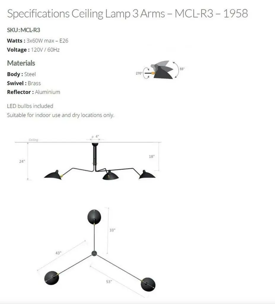 DESCRIPTION: Simple and elegant, this ceiling lamp makes a dramatic addition to a variety of room settings. With three rotating arms of differing lengths and heads that swivel and tilt, this lamp is capable of projecting light upwards, downwards. FEATURES:The asymmetrical design can be accentuated by rotating the arms on a horizontal planCUSTOMIZATION:Customization possible for the pendant and arms' lengths. Arm length = from vertical line of the pendant to the tip of the shade.Pendant = from the ceiling to the lowest part of the pendantSWITCH OPTIONS:The 3 Arm Ceiling Lamp is hardwired. The 3 light bulbs are controlled together from the same wall switch.Best fit dimmable LED bulbs providedWHAT SETS US APART? - Technical expertise - Full line of products - Availability - Customization - 5 year guarantee - Secured shipment - Small Repairs - After sale service - Experience (we introduced these lamps to the US, 23 years ago).WHAT TO LOOK OUT FOR:- No expensive international shipping, - No Customs fee- No deadlineAll lamps have been thoroughly inspected with our 44 check points upon arrival, which gives us the confidence to offer a 5-year guarantee to our clients.