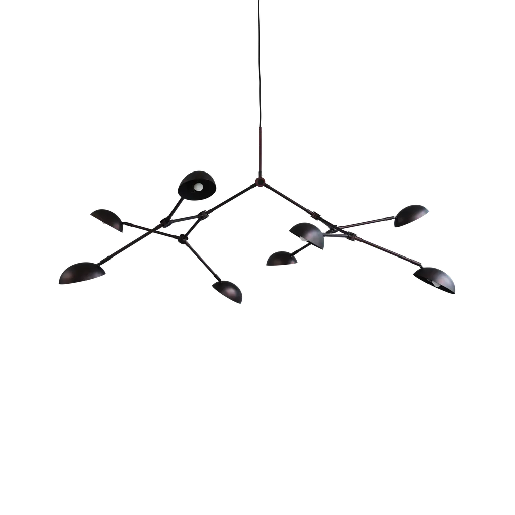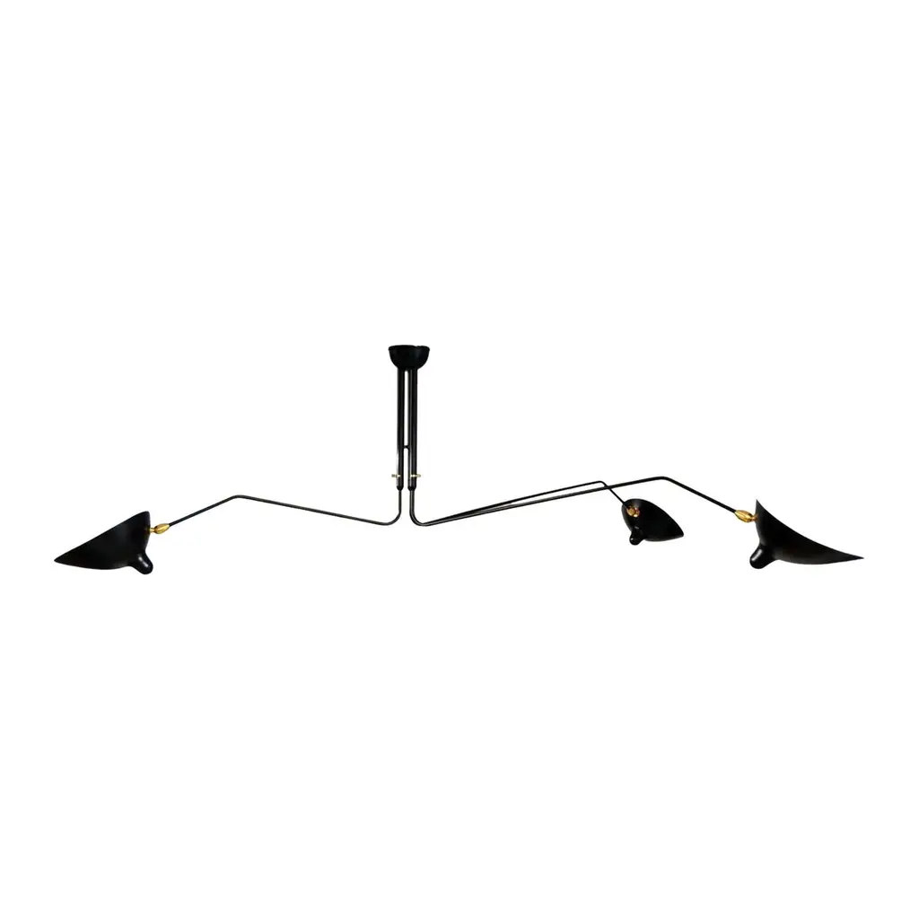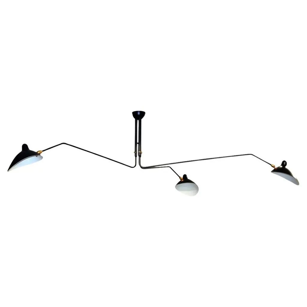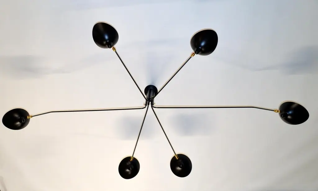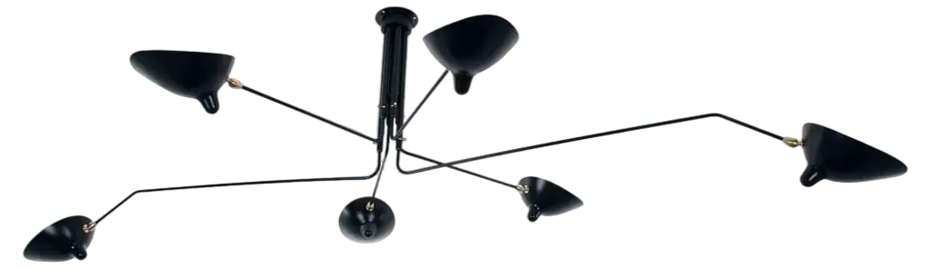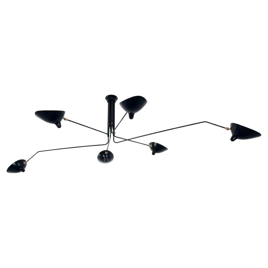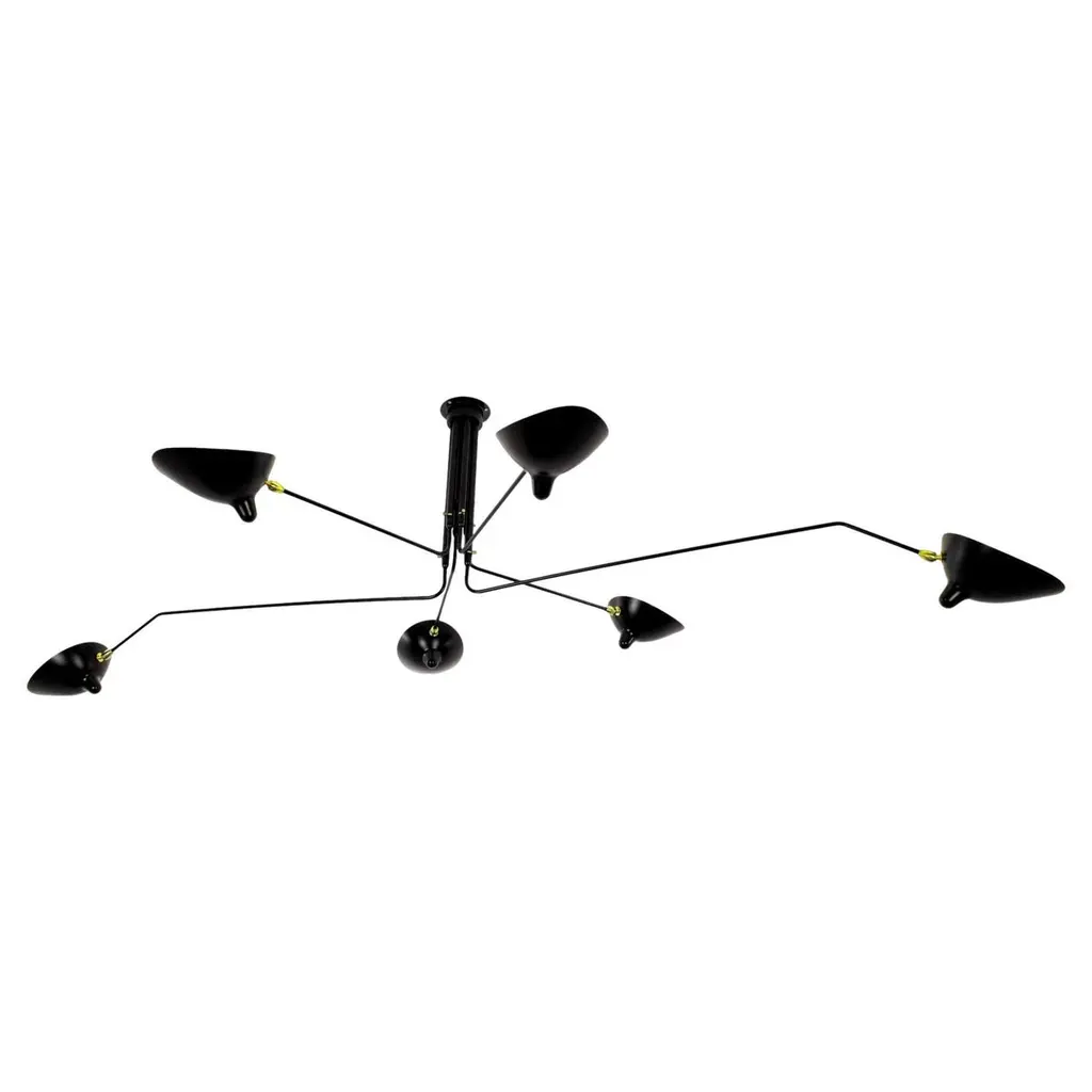 Impressively large, this six arm ceiling lamp is a Mouille classic. Tilting and rotating heads with rotating arms of 31 and 54 inches make this fixture a truly spectacular statement in a large room.Brass swivels connect the shades. The arms have brass stops.FEATURESIn neutral setting, the lamp is perfectly symmetrical, the 2 long arms being diametrally opposite, and so are the 2 other pairs of short arms. All 6 arms rotate on a horizontal plan, which makes this lamp highly versatile (it can be mounted in the corner of a room to give a general lighting plus a specific lighting to a dining table for example). Yet it is most often used as a center piece, in its symmetrical configuration.CUSTOMIZATIONCustomization possible for the pendant and arm's lengths. Arm length = from vertical line of the pendant to the tip of the shade.Pendant = from the ceiling to the lowest part of the pendantSWITCH OPTIONSThe 6 Arm Ceiling Lamp is hardwired. The 6 light bulbs are controled together from the same wall switch.Best fit dimmable LED bulbs providedWHAT SETS US APART? - Technical expertise - Full line of products - Availability - Customization - 5 year guarantee - Secured shipment - Small Repairs - After sale service - Experience (we introduced these lamps to the US, 23 years ago).WHAT TO LOOK OUT FOR:- No expensive international shipping, - No Customs fee- No deadlineAll lamps have been thoroughly inspected with our 44 check points upon arrival, which gives us the confidence to offer a 5-year guarantee to our clients.