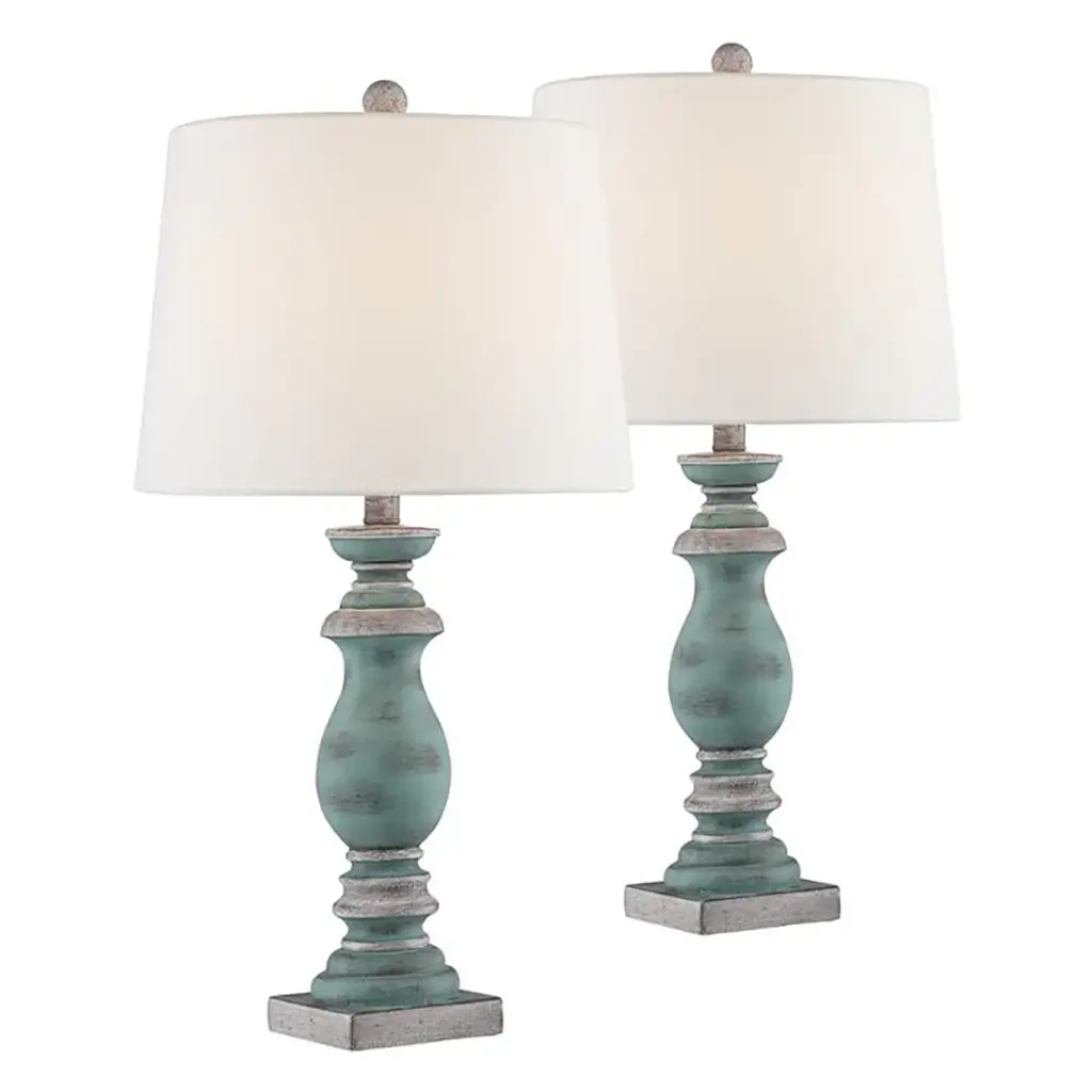 Product Details Set of 2 lamps. Each is 26 1/2" high overall. Bottom bases are 5" wide. Shades are 12" wide at the top x 14" wide at the bottom x 10" high. Weigh 4 lbs. Each lamp uses one maximum 150 watt standard-medium base bulb (not included). On-off socket switches. Traditional candlestick profiles ideal for rustic farmhouse or country cottage decor. Blue gray distressed, weathered finishes. Faux wood appearance, cast resin construction. Tapered fabric drum shades. 8-foot long clear cords with clear plugs.