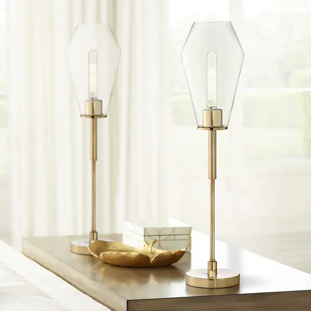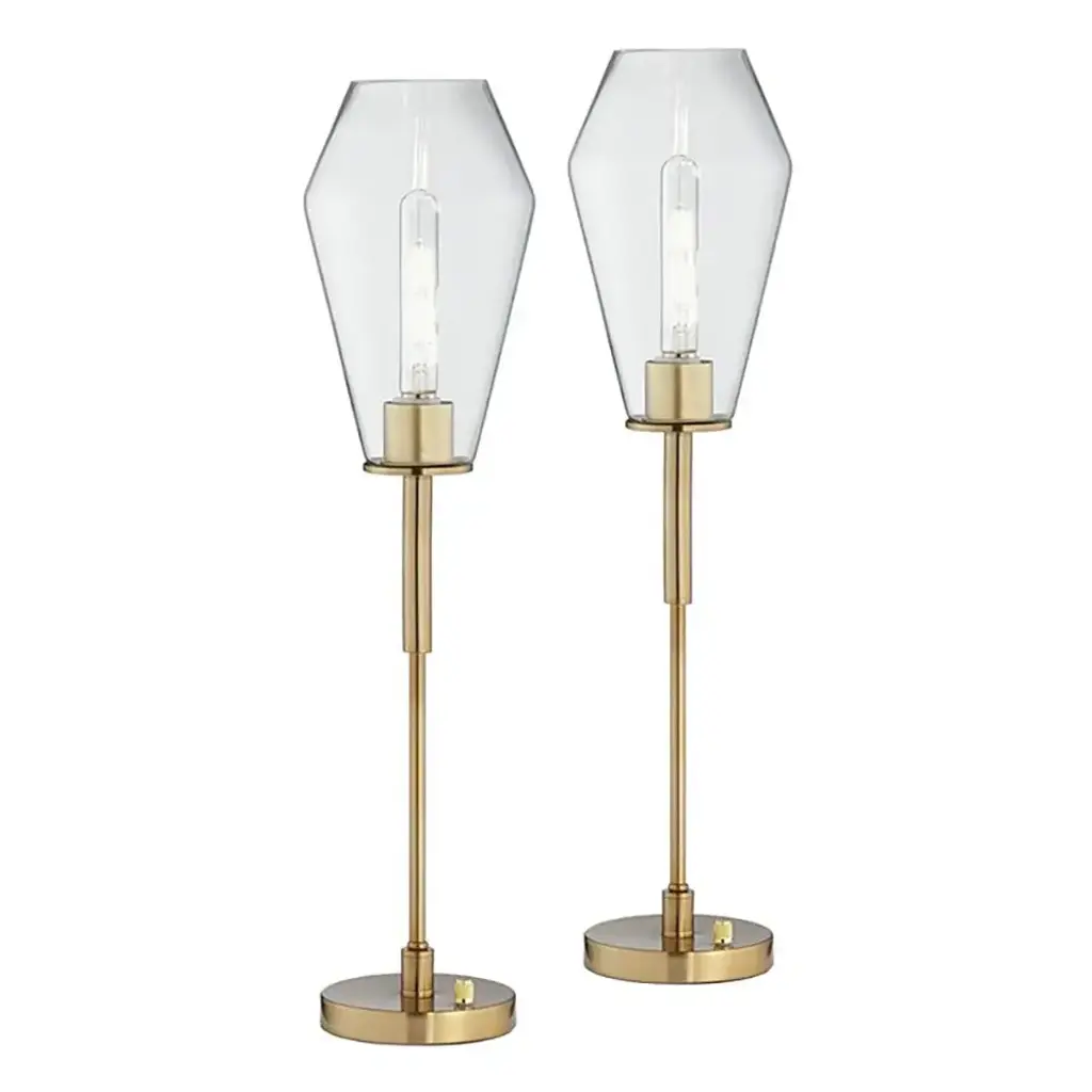 Product Details Set of 2 table lamps. Each is 28" high overall. Shades are 4" wide at the top x 6 1/2" wide in the middle x 11" high. Uses one maximum 60 watt standard-medium base bulb per table lamp (not included). Shown with clear glass tube bulbs. On-off rotary switch on base. Gold finish over metal construction. Clear glass shades. 8-foot long clear silver cords.