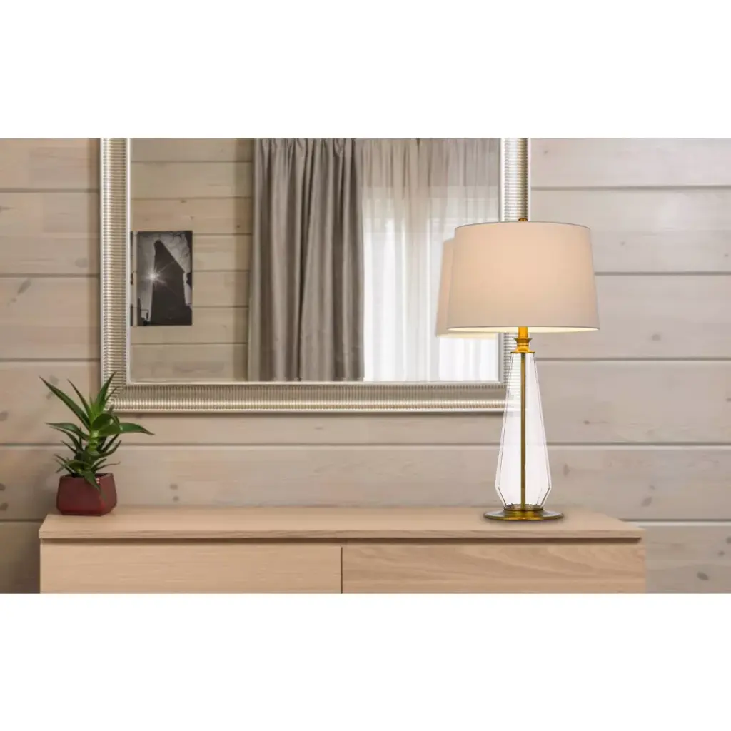 Cal Lighting's Southington pair of glass table lamps with metal accents and base in Antique Bronze finish. These lamps feature 150W 3-way switches and come with Hardback taper drum fabric shades. Add these Contemporary lamps to your Livingroom, family room, bedroom, or office. These lamps are only sold as a pair and both lamps and their matching shades ship in one carton.