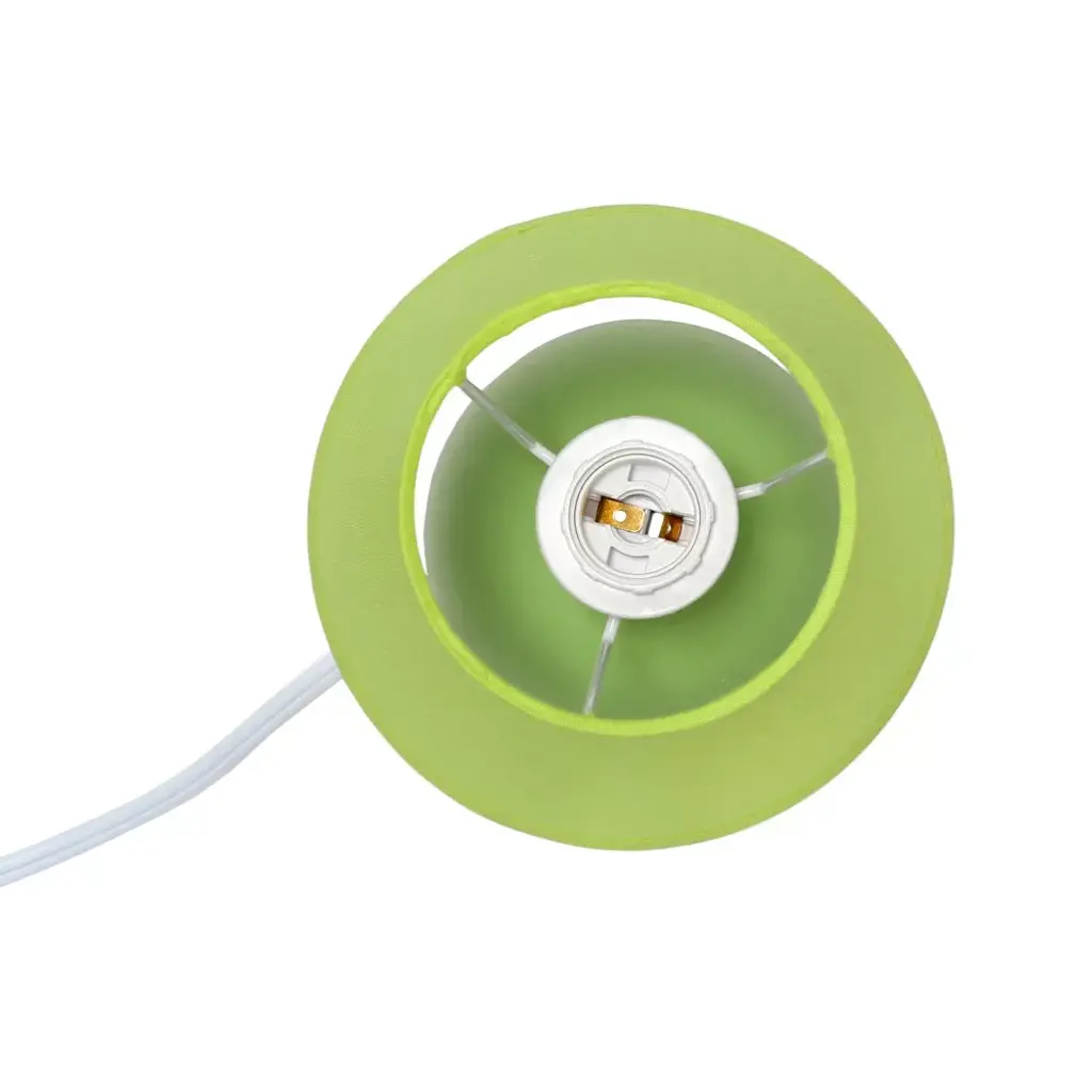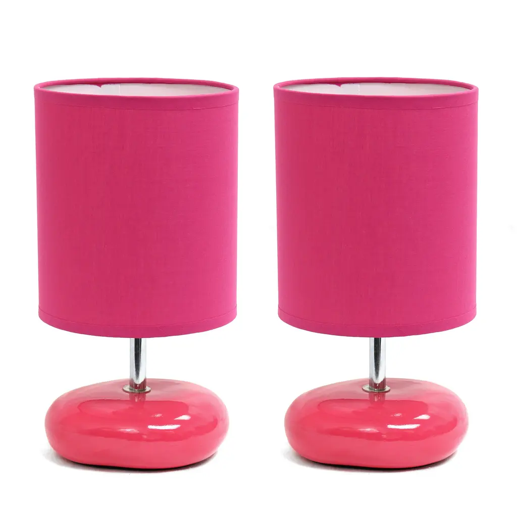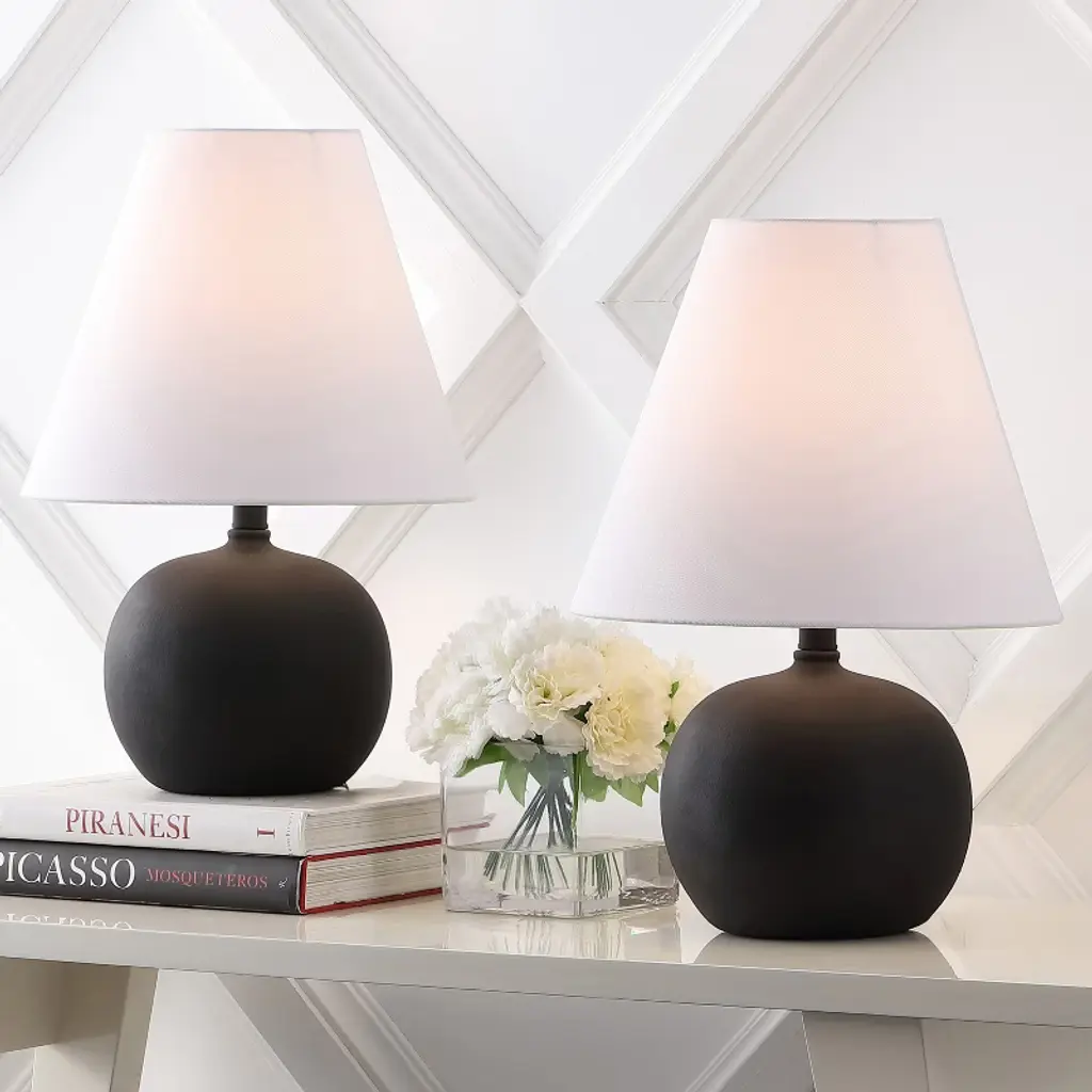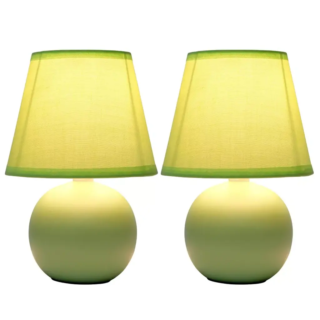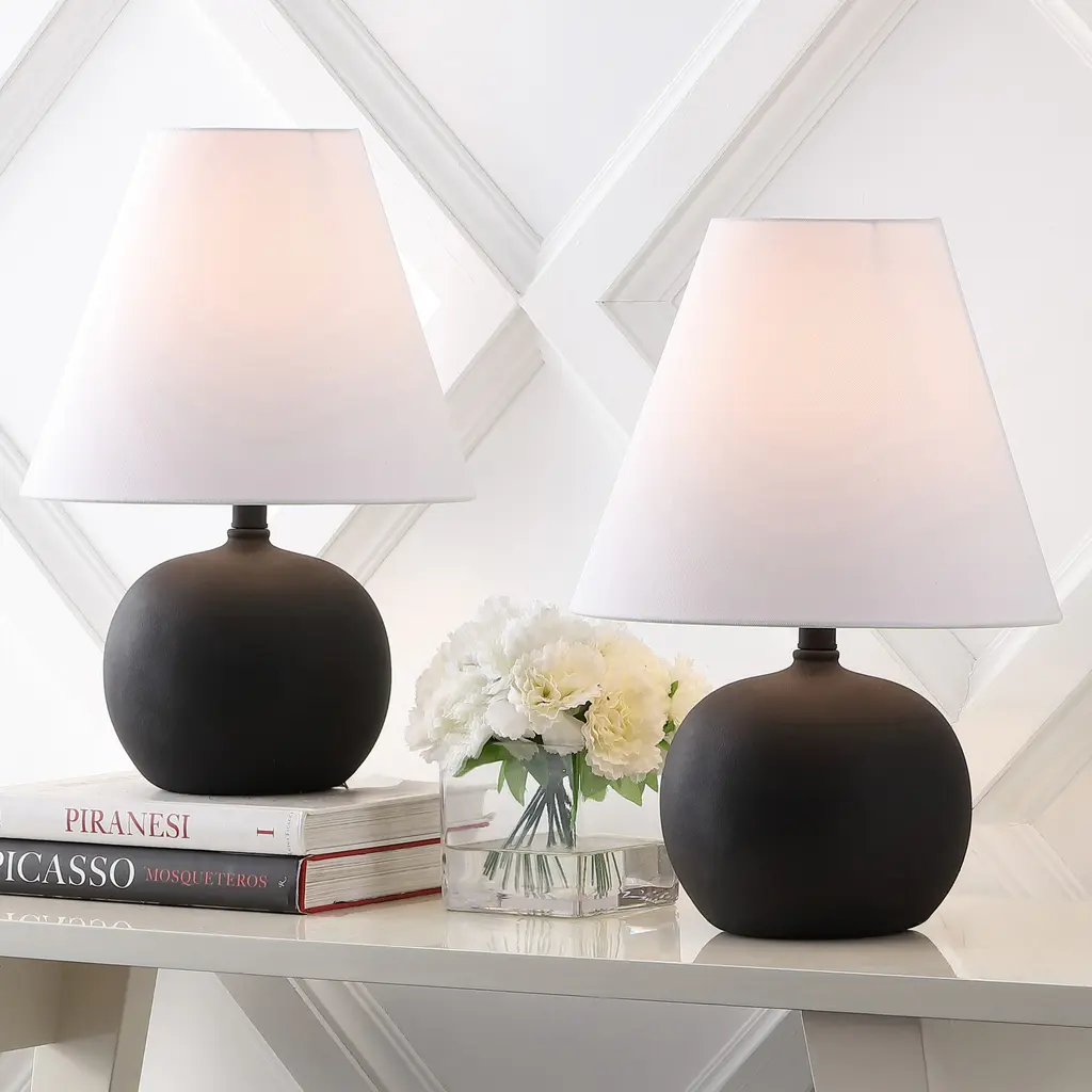 A petite table lamp set, each made primarily of ceramic with its base in the shape of a round orb sits beneath a matching colored tapered fabric shade for an overall effortlessly styled lamp suited for both your décor and lighting needs. A number of color options are available in this style, to compliment your decor just right.