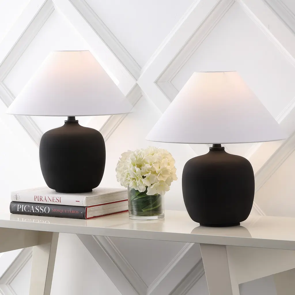 (Set of 2) 8.66" Petite Ceramic Orb Base Bedside Table Lamps with Matching Tapered Drum Shade Black - Creekwood Home