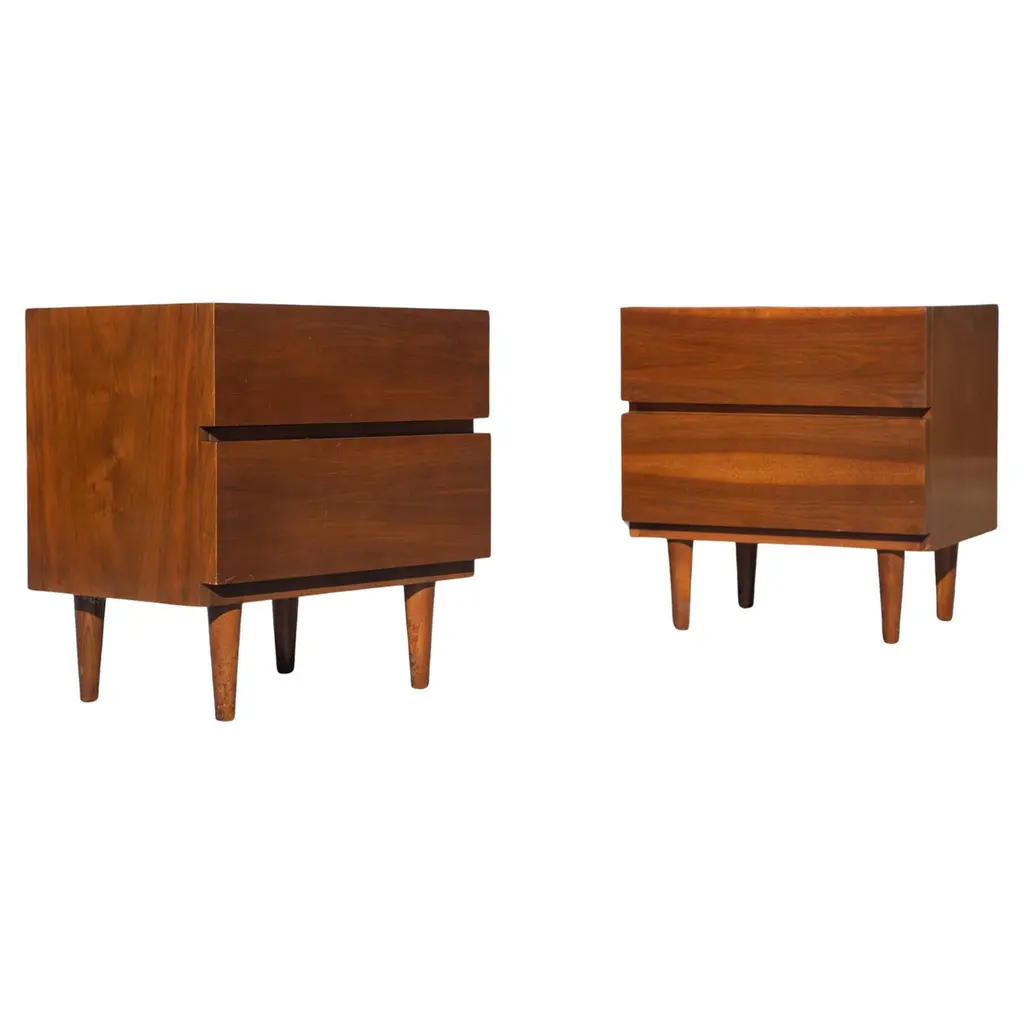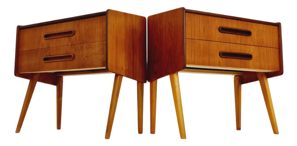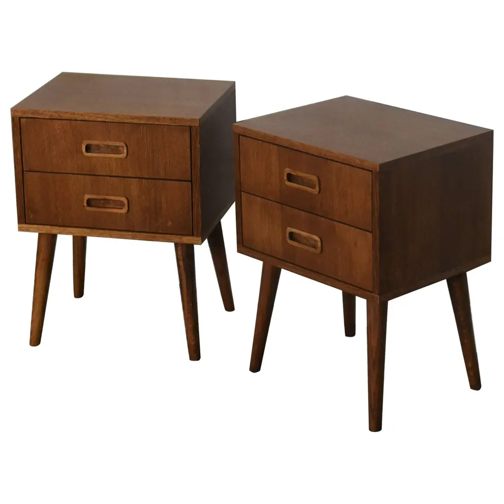 Set Of 2 Bedie Vela Bedstands by PastformDimensions: D 35 x W 45 x H 54 cm.Materials: Stained and varnished wood.Available in different wood color finishes: Whiskey, Rum, BPA, Nobel, Brandy, Schwarz, Cognac, Honig, Nevada, Dunkelbraun, and Natura. Please contact us.A bedside cabinet is a piece of furniture that is both useful and decorative. It is useful when we want to have a glass of water at hand at night or in the morning. We put on it piles of books and magazines that we like to read, glasses, cosmetics, and other small items. Therefore, it is important that there is a lot of space inside and outside. Bedie Sils retro bedside cabinets have been created for those who need some more space. They have two drawers and a large top, on which you can put a bedside lamp and a flower pot, and still, there is a lot of space for other items.Bedside cabinets do not necessarily have to stand in a bedroom. The Bedie Vela is so versatile that it can be successfully placed in a living room or a hallway. Its drawers can be opened with recessed round handles in a contrasting black color.The furniture is entirely made of wood covered with oak veneer. Our furniture is made of only natural materials, so individual models may differ in the arrangement of grain and color. Bedie Vela Bedside Cabinet is finished with stain and varnish.Rooted in a good traditionThe Pastform Furniture studio dates back to the 1990s. Having in mind the idea of a traditional family company, Dawid Gełeta established a carpenter’s shop in 1997. The company specializes in the manual production of utility furniture. Times have changed and with them, fashion has changed. In 2016 we decided to change the direction, following the growing demand for vintage furniture.My name is Mateusz Gełeta, I am the son of the carpenter who founded the company. From an early age, I have watched my dad’s work. He put his whole heart into creating furniture, polishing every detail with his strong hands and making sure that nothing escaped our attention before sending the product to the customer. He made sure that every piece of furniture was perfect and refined. We remain true to these principles.Following the blow, I decided to create a harmonious combination of modern quality with the classic style of the 1960s. This is why I designed and created a unique collection of wonderful furniture, which, in addition to its well-thought-out functionality, also creates a perfect design and composes original arrangements.The golden age of interior designIn the 1960s interiors used to take on a very characteristic touch. All over the world, this style was called a mid-century modern, locally it was simply – retro furniture. Simple, elegant minimalistic form, without unnecessary decorations and splendor. Decorating with the idea of an uncomplicated composition, it allows for an undisturbed selection of the arrangement accessories and emphasizes a high level of functional comfort. One might say – a perfect piece of furniture. Comfortable, hiding surprisingly many items despite quite neat dimensions, made of noble species of wood and created by hand, with a focus on carefully refined details. No wonder its popularity is growing so much.Unique, refined, with a soulEach piece of the Pastform collection represents a unique style. Thoughtful concept of usable comfort, refined details, carefully selected raw materials, and proven accessories. We use only high-quality boards which we veneer with oak, American walnut, and other durable wood species. They are carefully oiled with the best, hard, ecological oil waxes, giving the furniture its final shape. This technology brings out the natural beauty of wood, exposes the grain and unique design of each piece, highlights the beautiful color, and allows to achieve timeless durability.This is how unique, thoughtful, and refined furniture with a soul is created.Thinking about futureWe are trying to positively create the world of which we are a part, contributing to a better tomorrow. We cooperate with local suppliers, support small companies and production plants, care for ecology, and respect the needs of the land. We always strive to establish long-lasting, based-on-trust relationships with customers and contractors.Flexible, with openness and heart on handWe sincerely like what we do. Playing with the shape, structure, and texture of wood is fascinating. Creating new arrangements and coming up with innovations that will meet your expectations. We are proud of our products and we are happy to present you with our collection of refined furniture.All our vintage furniture can be made on request – fulfilling the boldest dreams and fantasies. See our offer and if you want to know more, feel free to contact us. We are waiting for you!