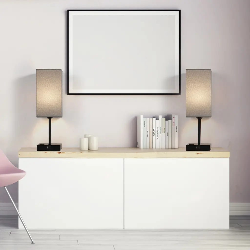 Set Of 2 Bedside Table Lamp With 2 Usb Charging Ports &1 Ac Outlet - Grey