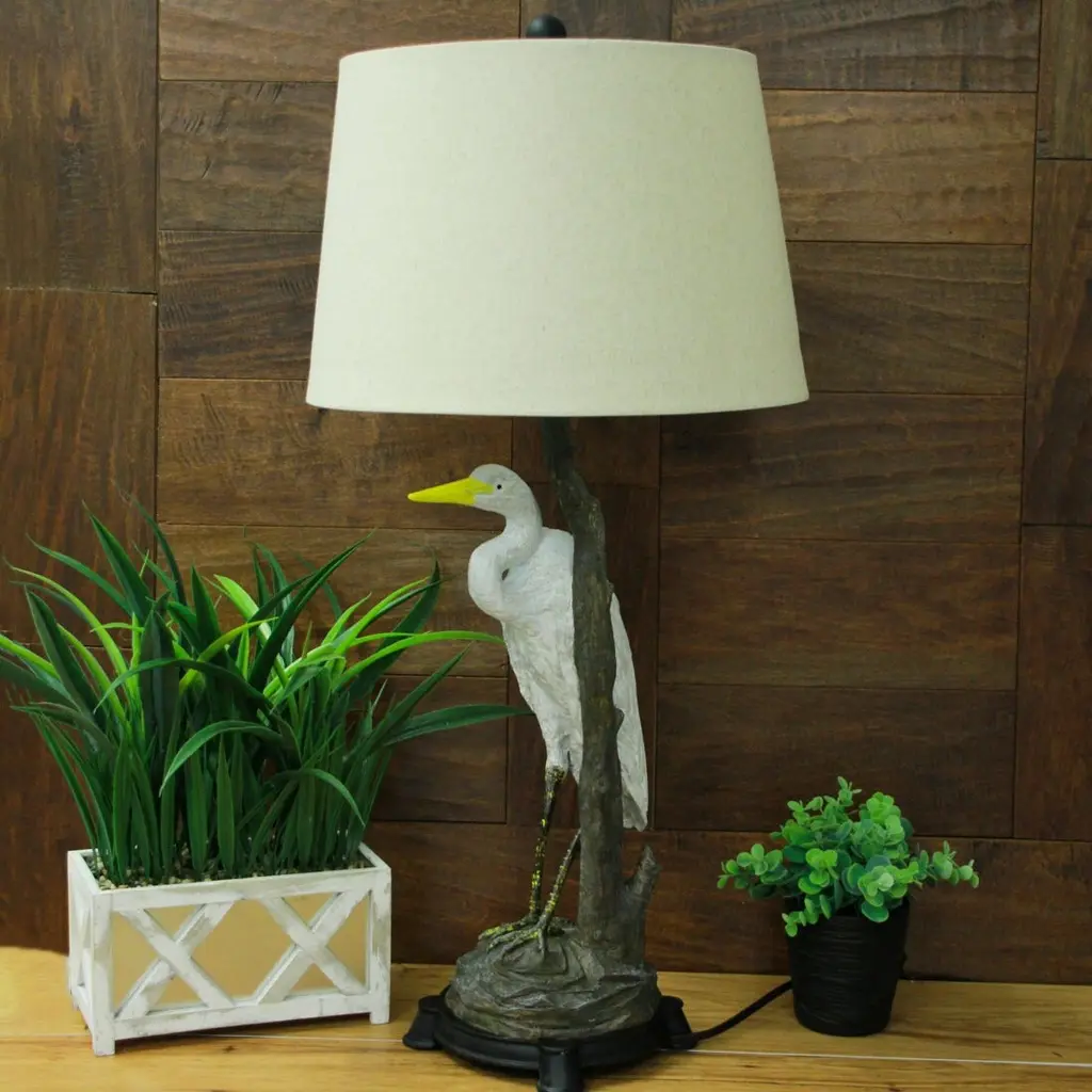 Illuminate your space with the timeless elegance of this set of two handpainted Great White Heron table lamps. Standing 30.5 inches high with a diameter of 14.5 inches, these lamps are designed to add a touch of coastal charm to your decor. Each lamp features a beautifully detailed heron design, meticulously handpainted to capture the graceful essence of these majestic birds. Ideal for both tropical bedrooms and living rooms, these lamps provide a warm, inviting glow that highlights their unique artistic details. Their generous size and exquisite craftsmanship make them a striking focal point on nightstands, end tables, or any surface needing a touch of coastal elegance. Elevate your home decor with these charming lamps that blend functionality with artistic flair, bringing a serene, beach-inspired ambiance to any room. Perfect for those who appreciate fine art and nautical themes.