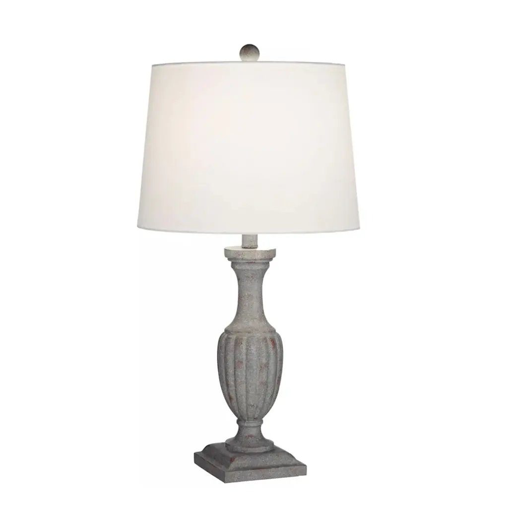 PRODUCT DETAILS: Set of 2 lamps. Each is 26" high overall. Shades are 12" across the top x 14" across the bottom x 10" high. Each uses one maximum 150 watt standard-medium base bulb (not included). On-off socket switches. Candlestick profile lamps set from the Regency Hill brand. Ideal for rustic traditional rooms, farmhouse decor, or coastal decorating. Gray-washed finish faux wood lamp bases. Neutral washed look. Cast resin construction. Tapered white linen fabric drum shades. 8-foot long clear-silver cords.