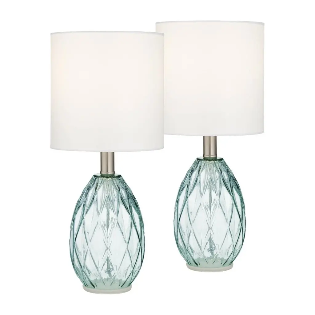 PRODUCT DETAILS: Set of 2 lamps. Each is 14 3/4" high overall. Bases are 3 1/4" wide at the bottom. Shades are 7 1/2" high x 8" wide. Weighs 2 lbs. each. Each lamp uses one maximum 60 watt standard-medium base bulb (not included). On-off switch on the socket. Set of two small accent table lamps. Contemporary modern lamps also great for coastal style room decor. Blue-green translucent glass construction. Diamond patterned textured body. Handcrafted glass may vary slightly in color. Open bottom design. Fabric drum shades. 8-foot clear cord and plug for each lamp.